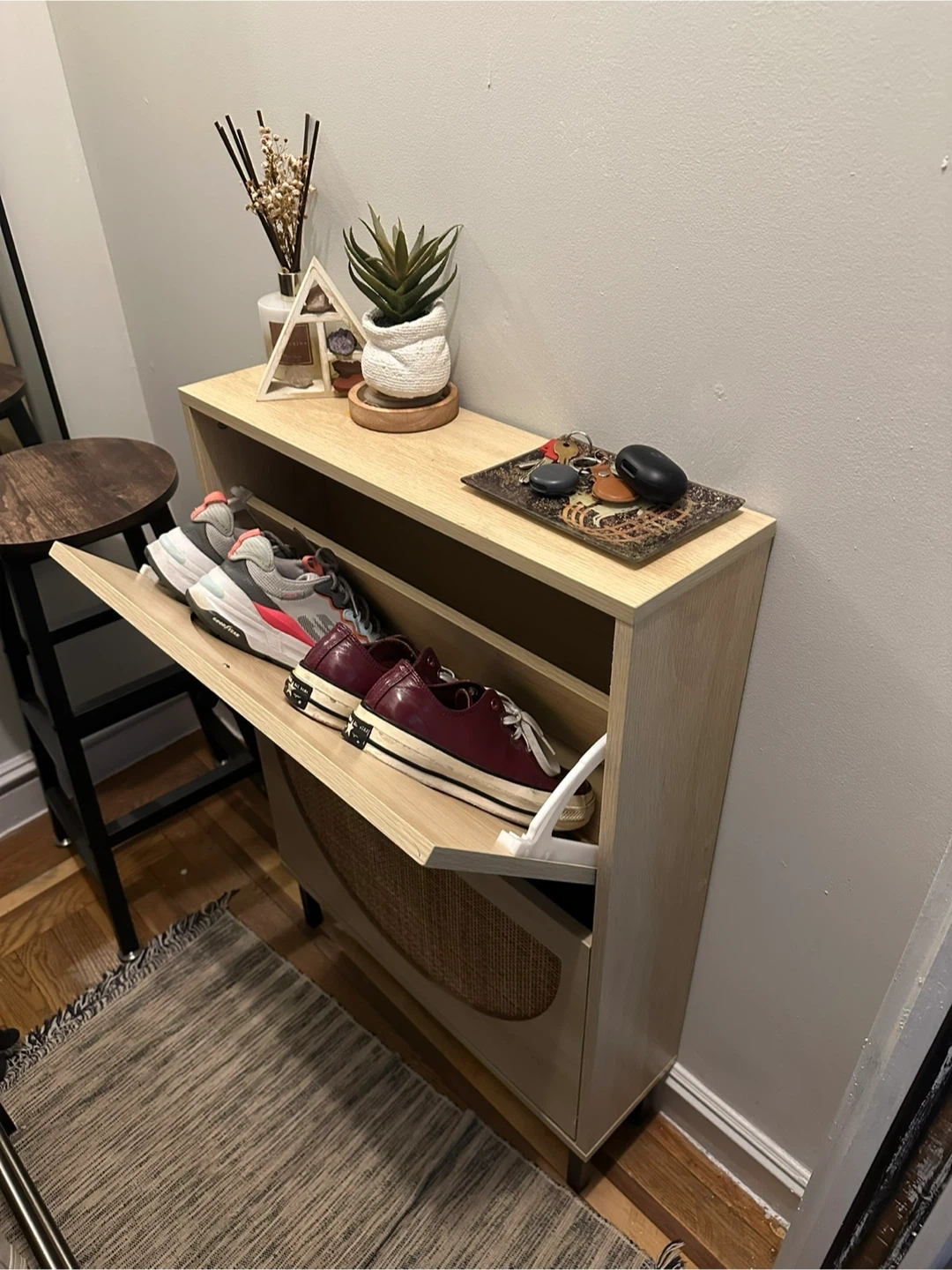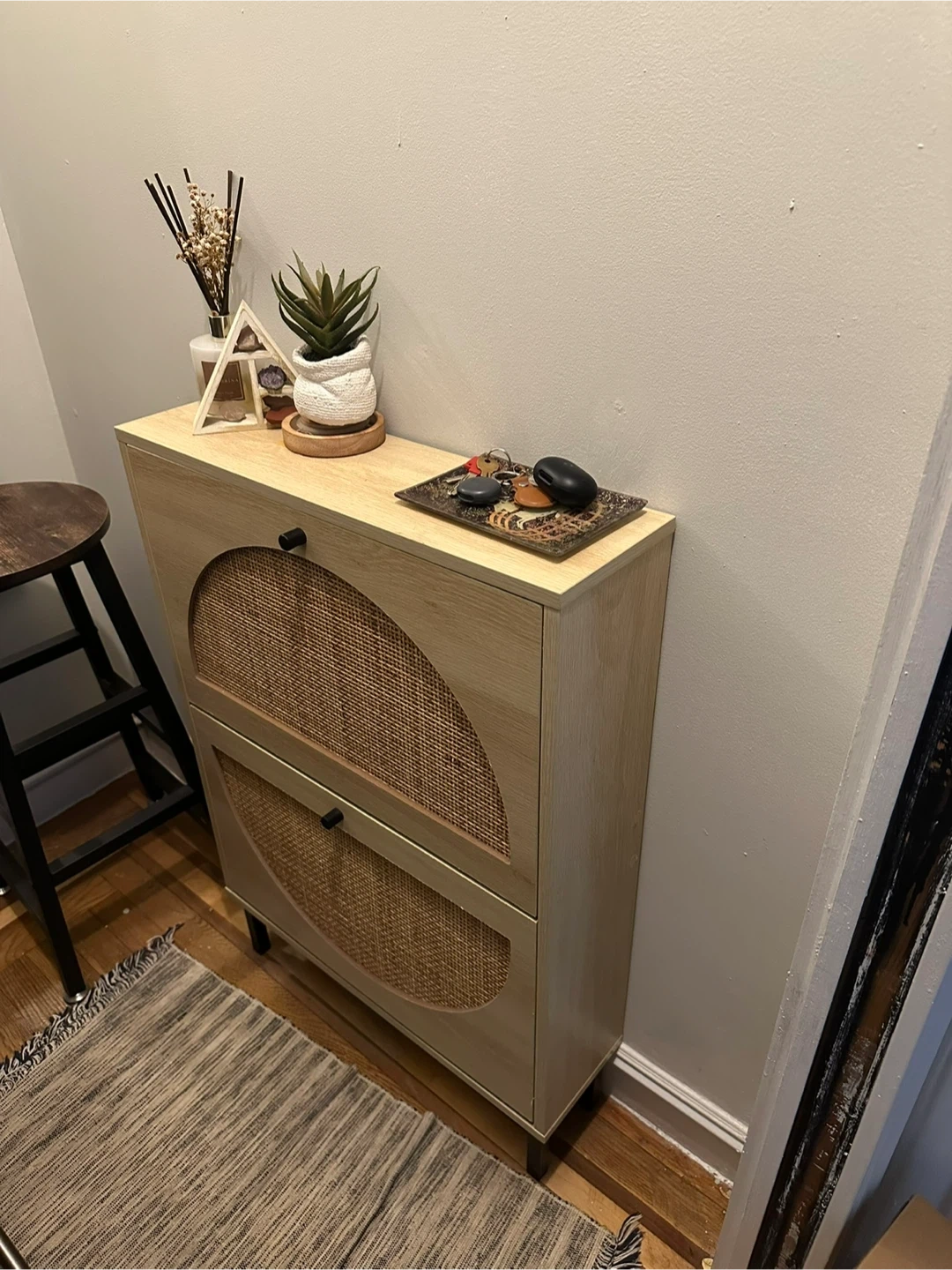 65Selling a rattan shoe cabinet! It's a stylish and functional piece for organizing your shoes. The rattan detailing adds a touch of texture and visual interest to any space. It's in great condition and ready to find a new home