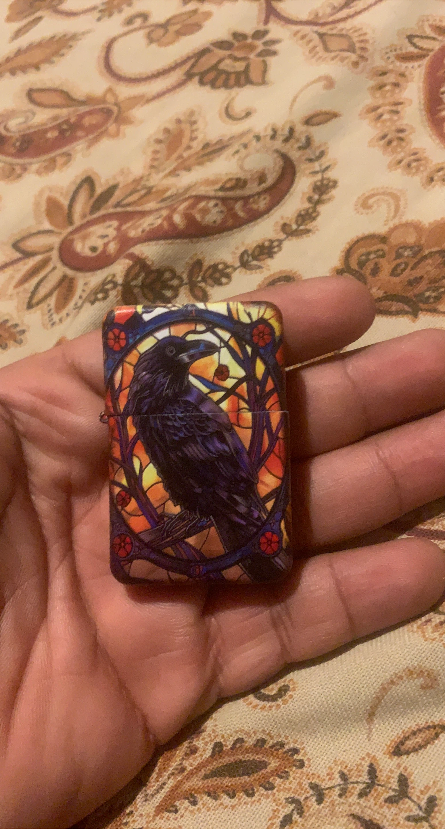 Offering a unique lighter featuring a raven design with stained glass style accents. It's in good condition and ready for a new home!
