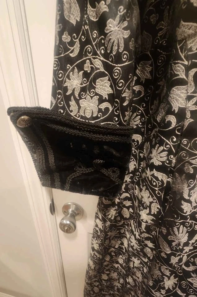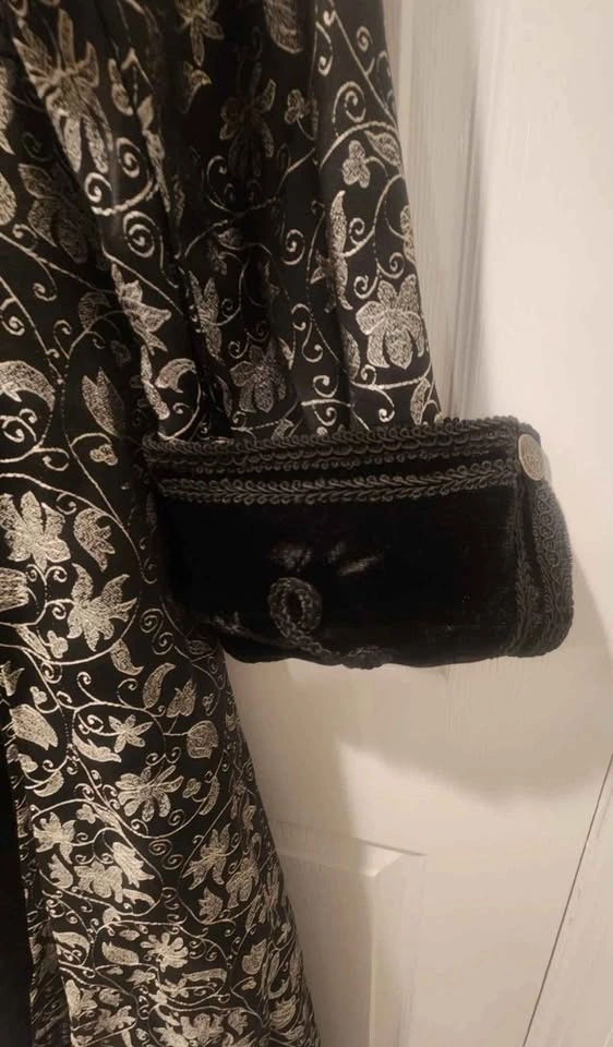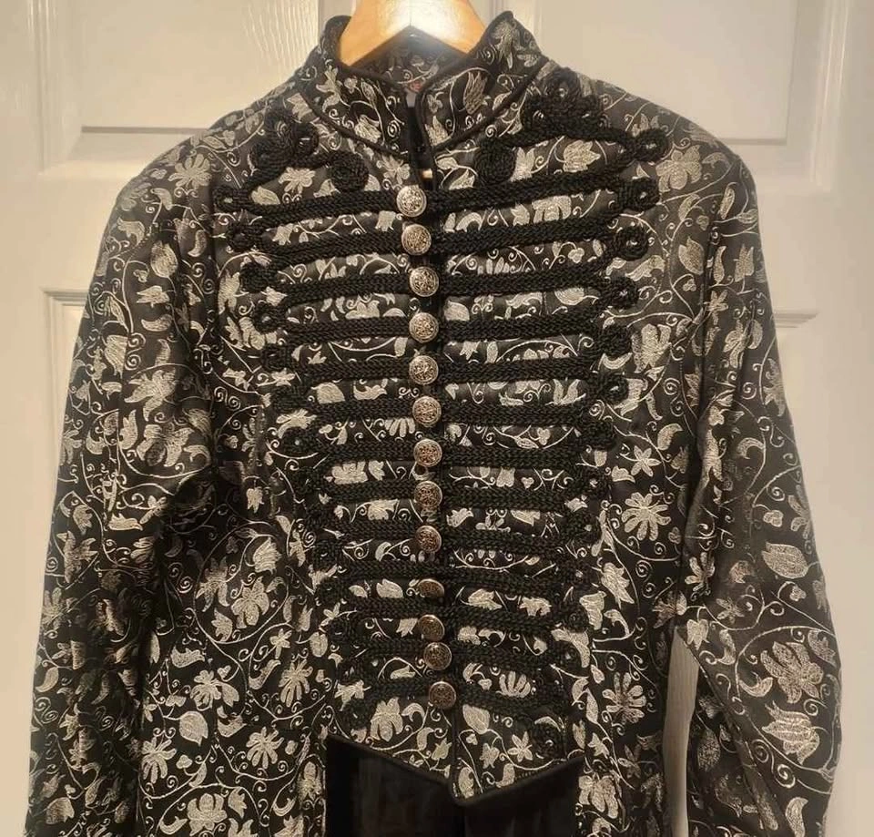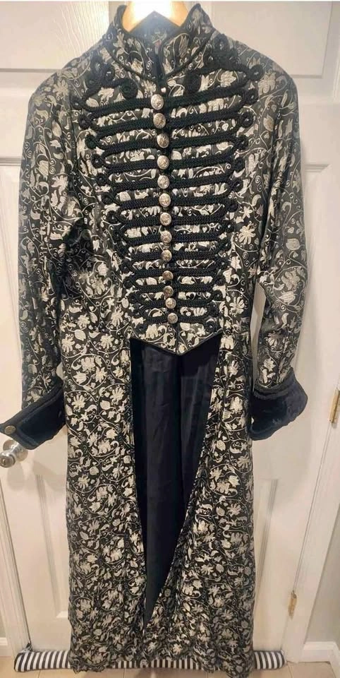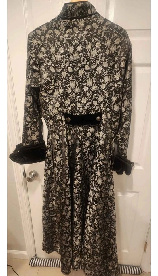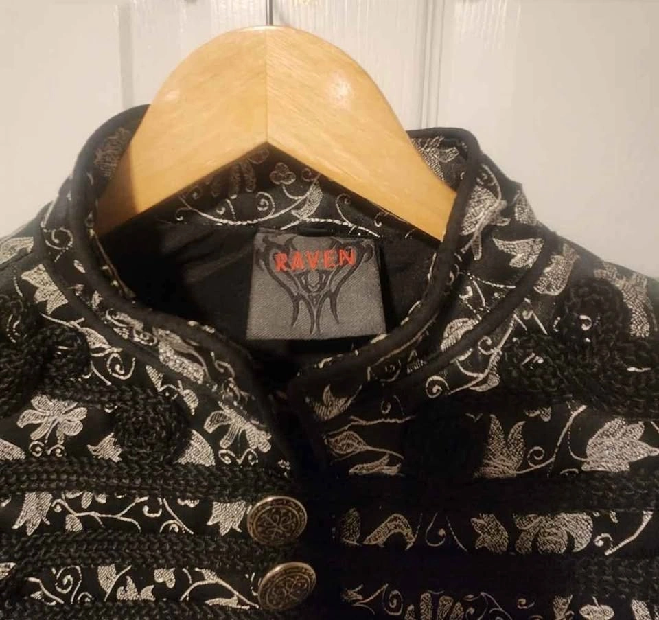 The Raven vintage gothic steampunk brocade long black/ antique silver jacket in size L is a unique and stylish piece perfect for any party or cocktail occasion. Made from brocade fabric with studded accents, this jacket has a button and open front closure. The long trench coat style features a solid black pattern, making it a versatile option for all seasons. Handmade with a gothic theme, this jacket also embodies elements of hipster, rock, and punk fashion, making it a standout piece for those looking for a bold and edgy outerwear option. Please check out my other listings for more vintage items!