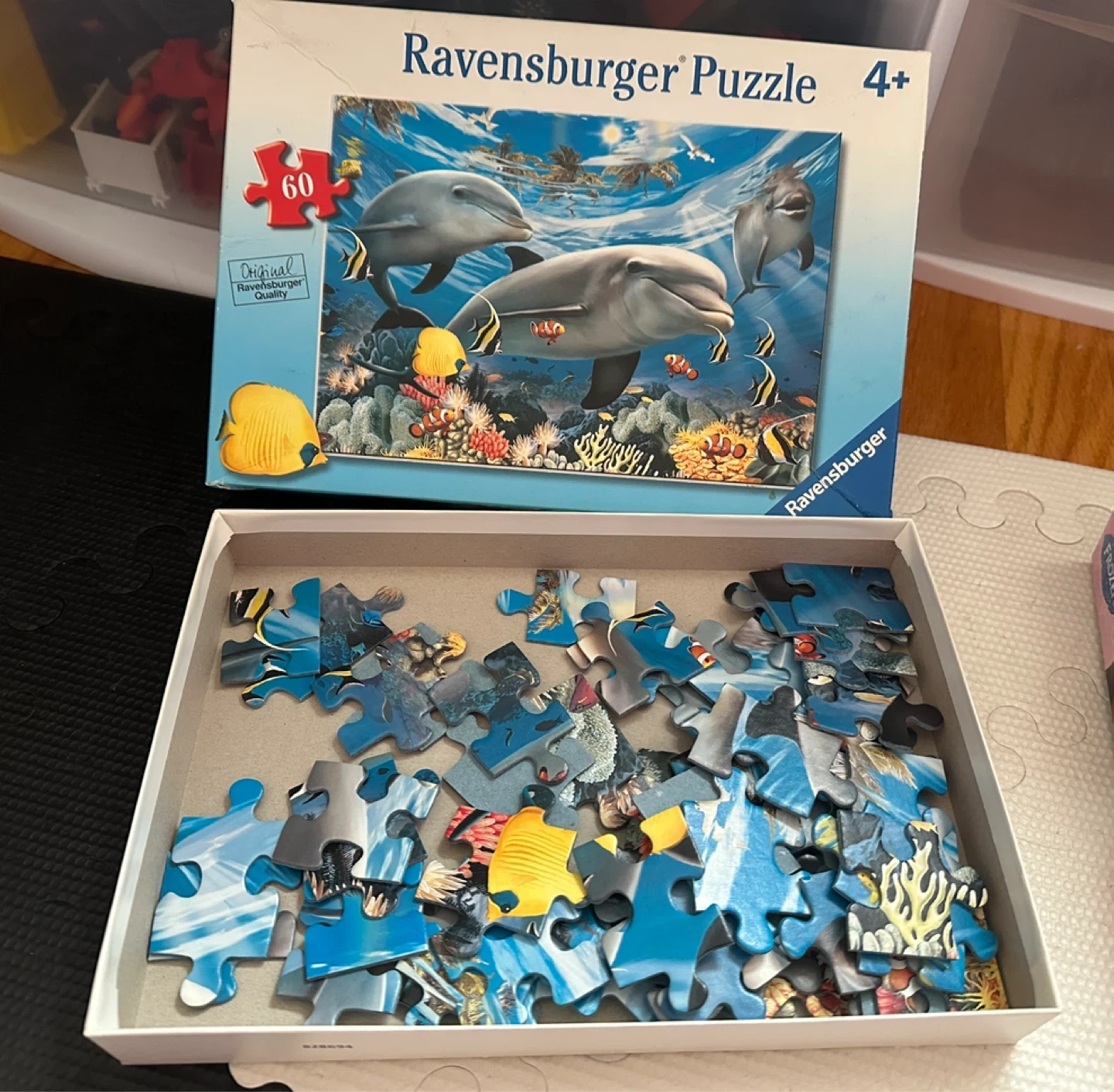 14Selling a Ravensburger puzzle with 60 pieces! The puzzle features a colorful underwater scene with dolphins and fish. It's suitable for ages 4+. The box is included