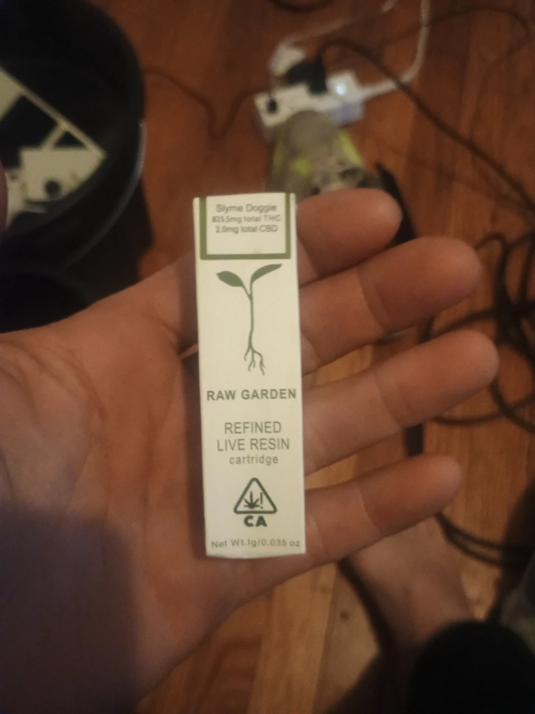 60Selling a RAW GARDEN Refined Live Resin cartridge. It contains Slyme Doggie with 825.5mg total THC and 2.0mg total CBD. Net weight is 1g/0.035 oz