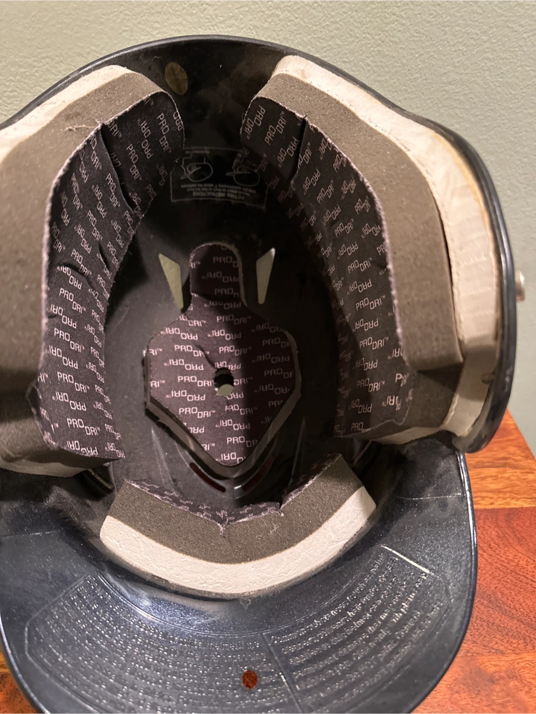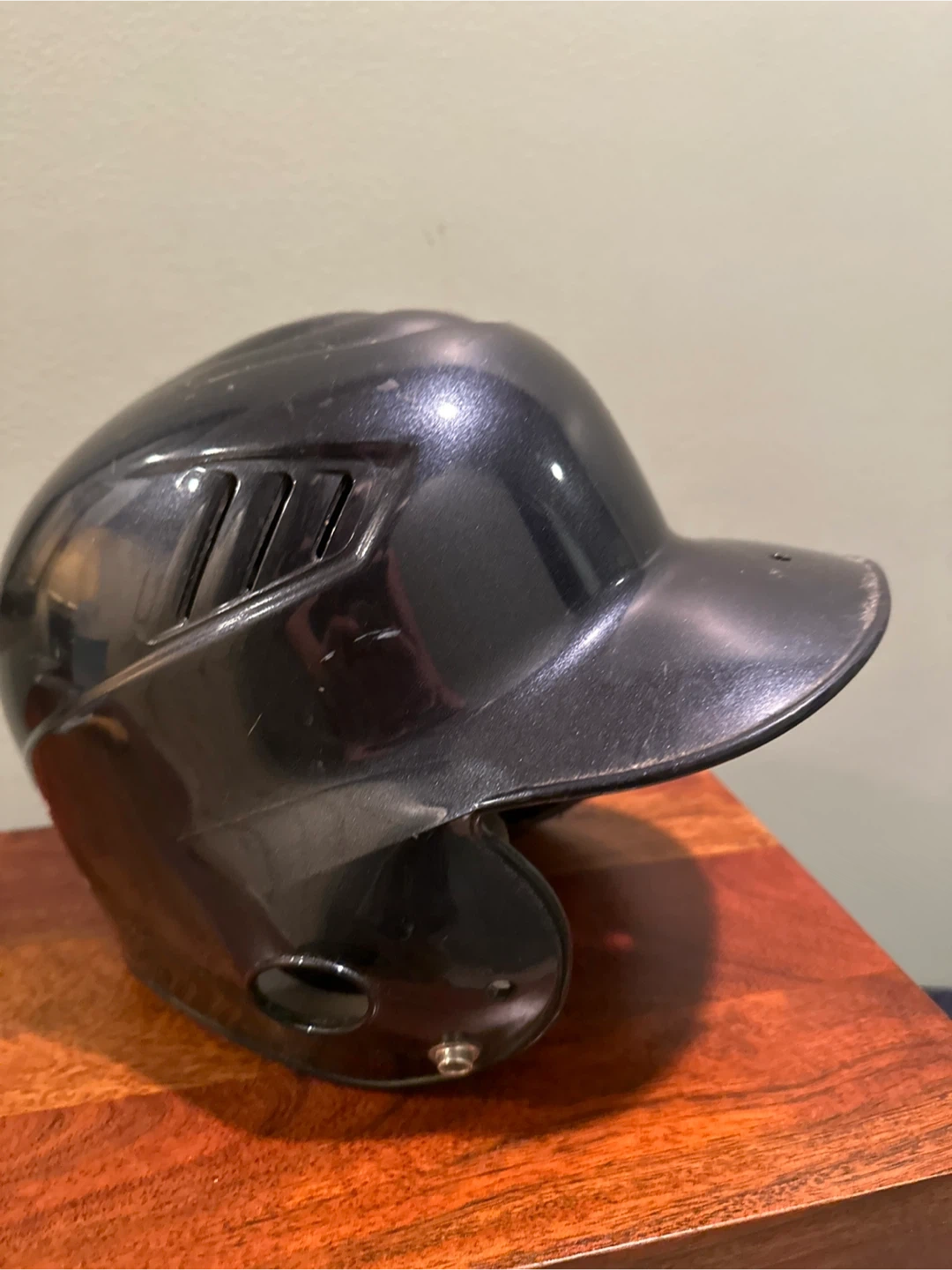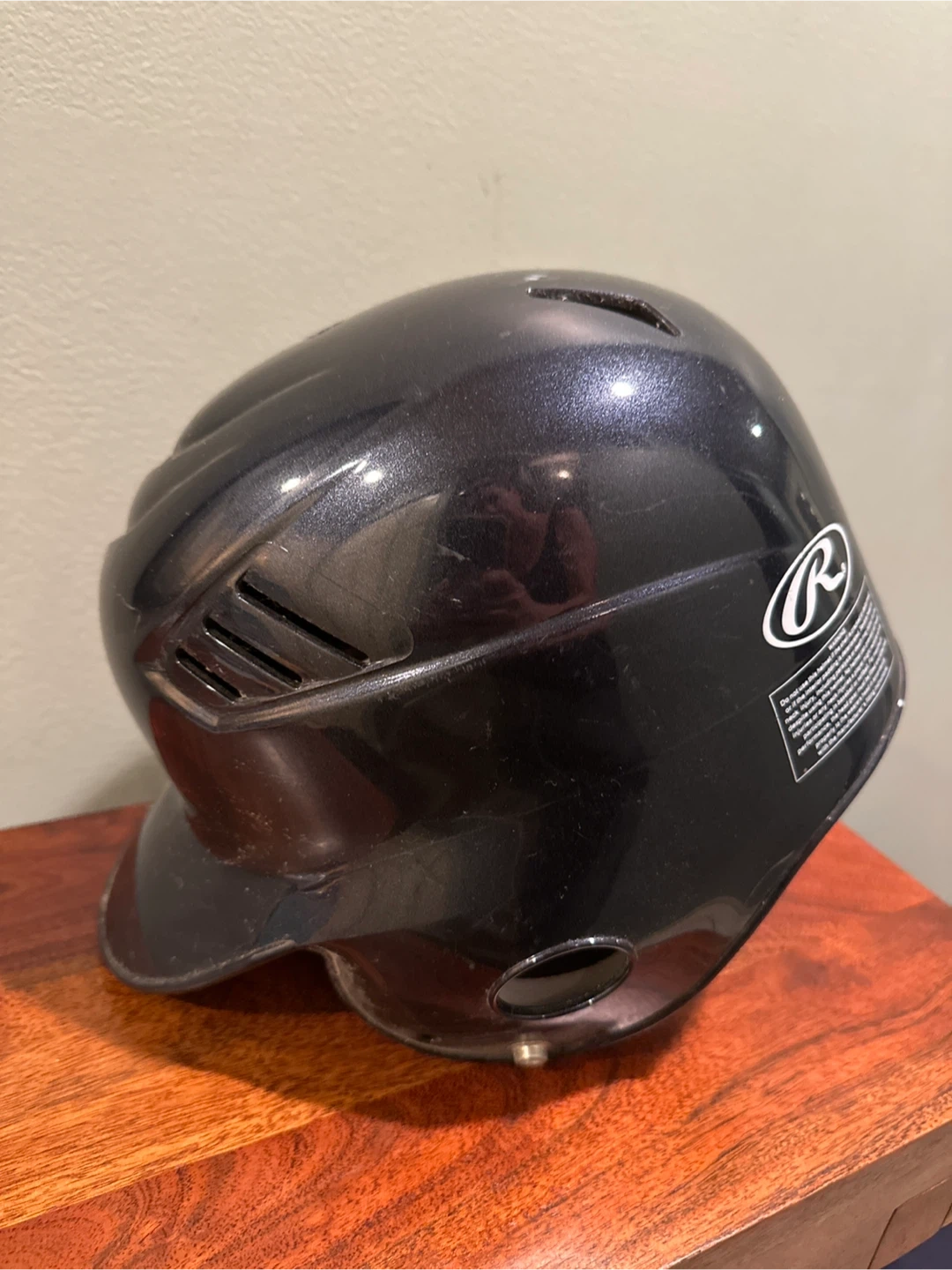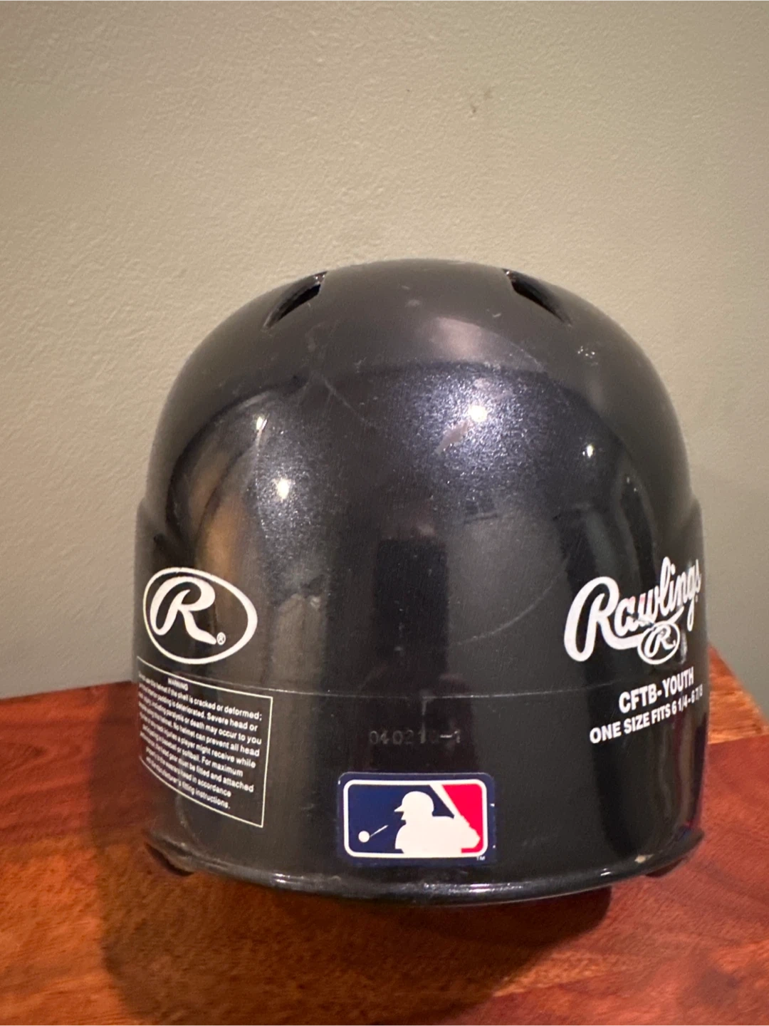 Here is a Rawlings CFBTB-Youth baseball helmet. It is black and one size fits most. It is in good condition.