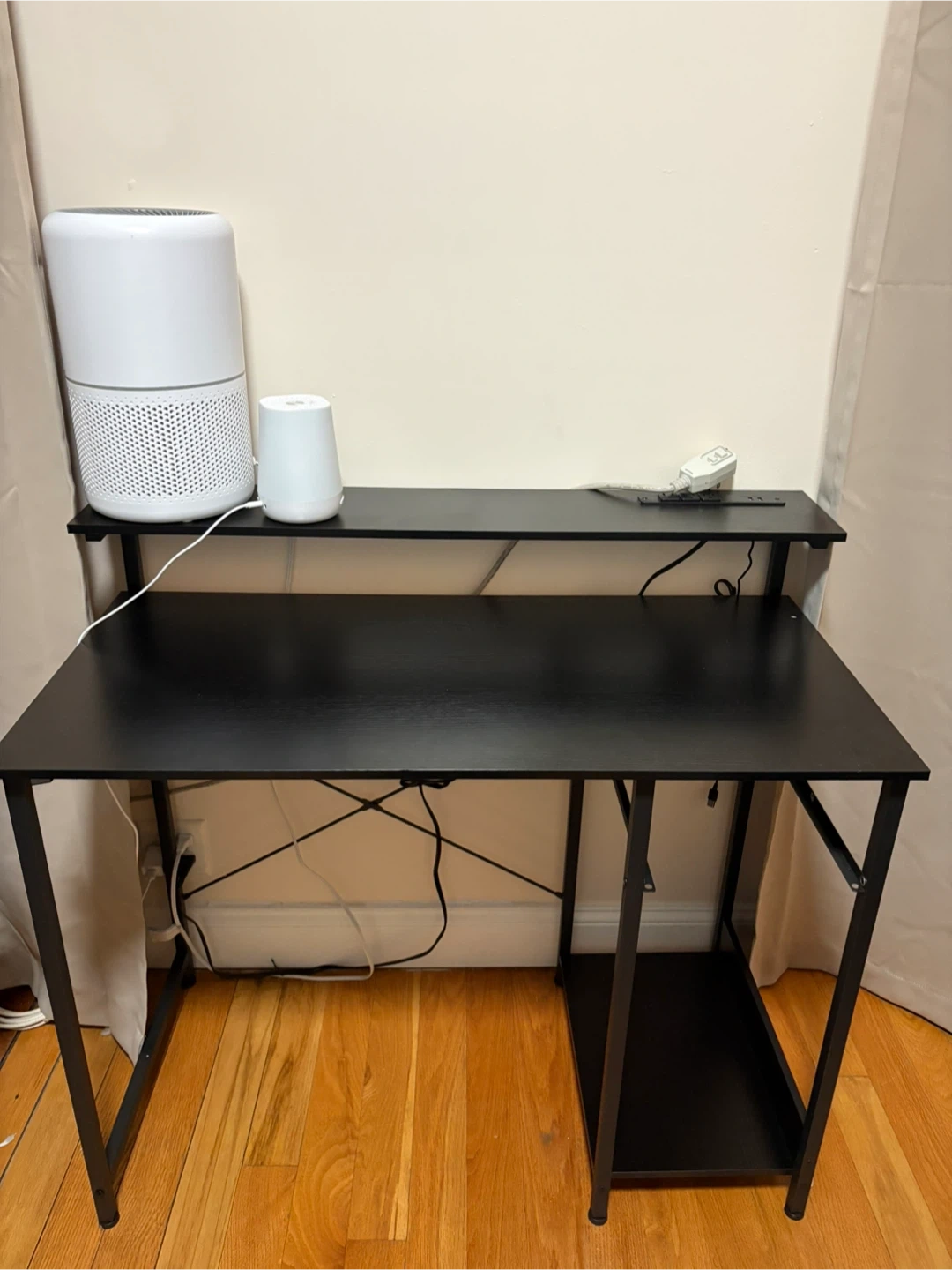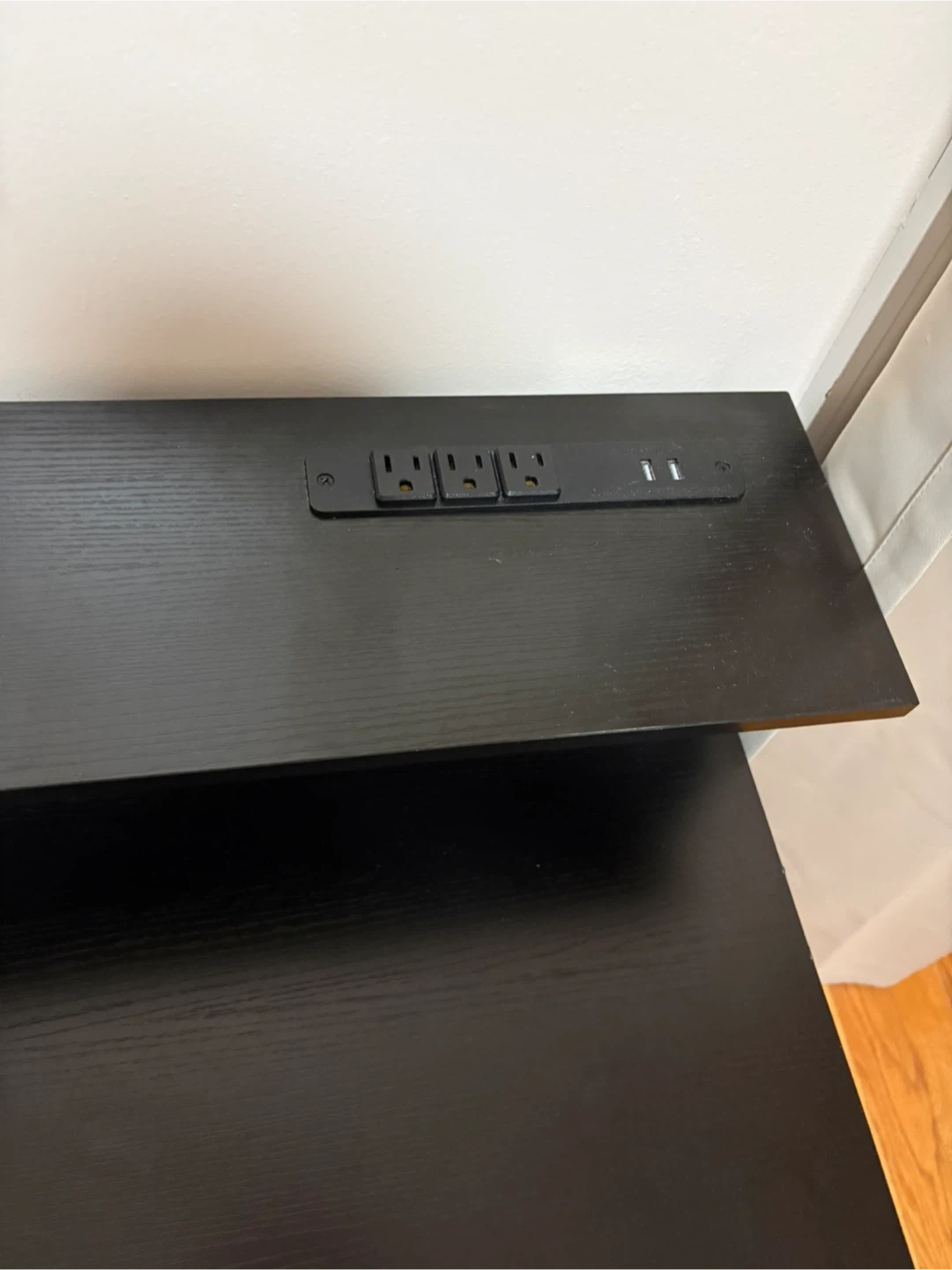 Selling a black desk that's in great condition! It features a convenient shelf and built-in power outlets with USB ports. Perfect for a home office or study space! All it’s missing it’s a box that goes on the right corner