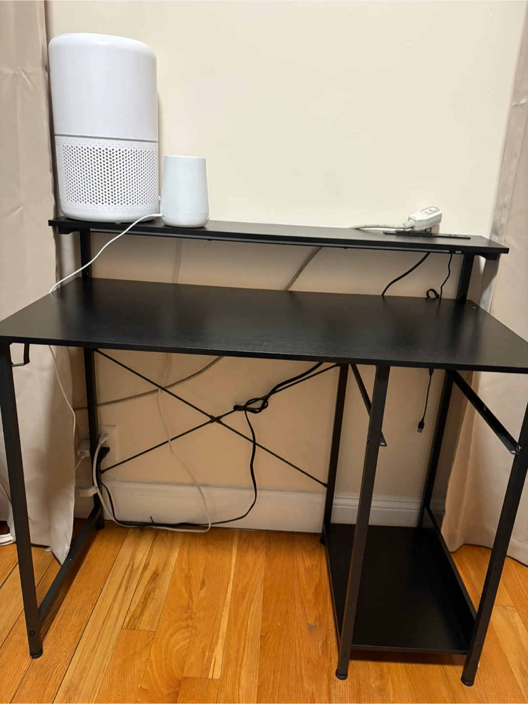 Selling a black desk that's in great condition! It features a convenient shelf and built-in power outlets with USB ports. Perfect for a home office or study space! All it’s missing it’s a box that goes on the right corner