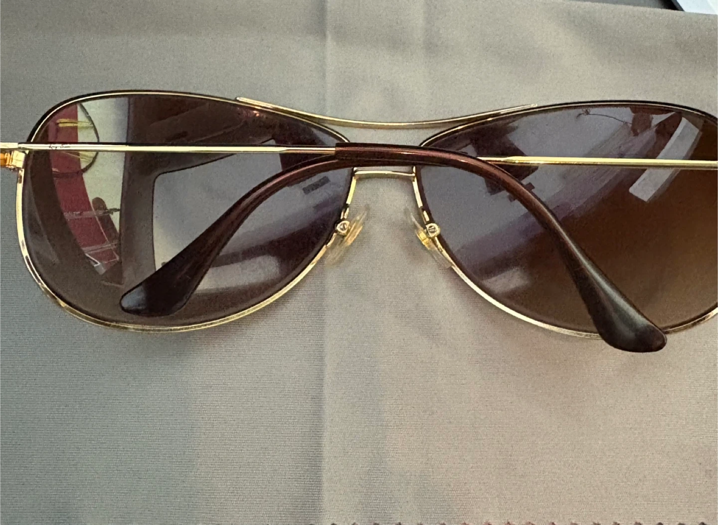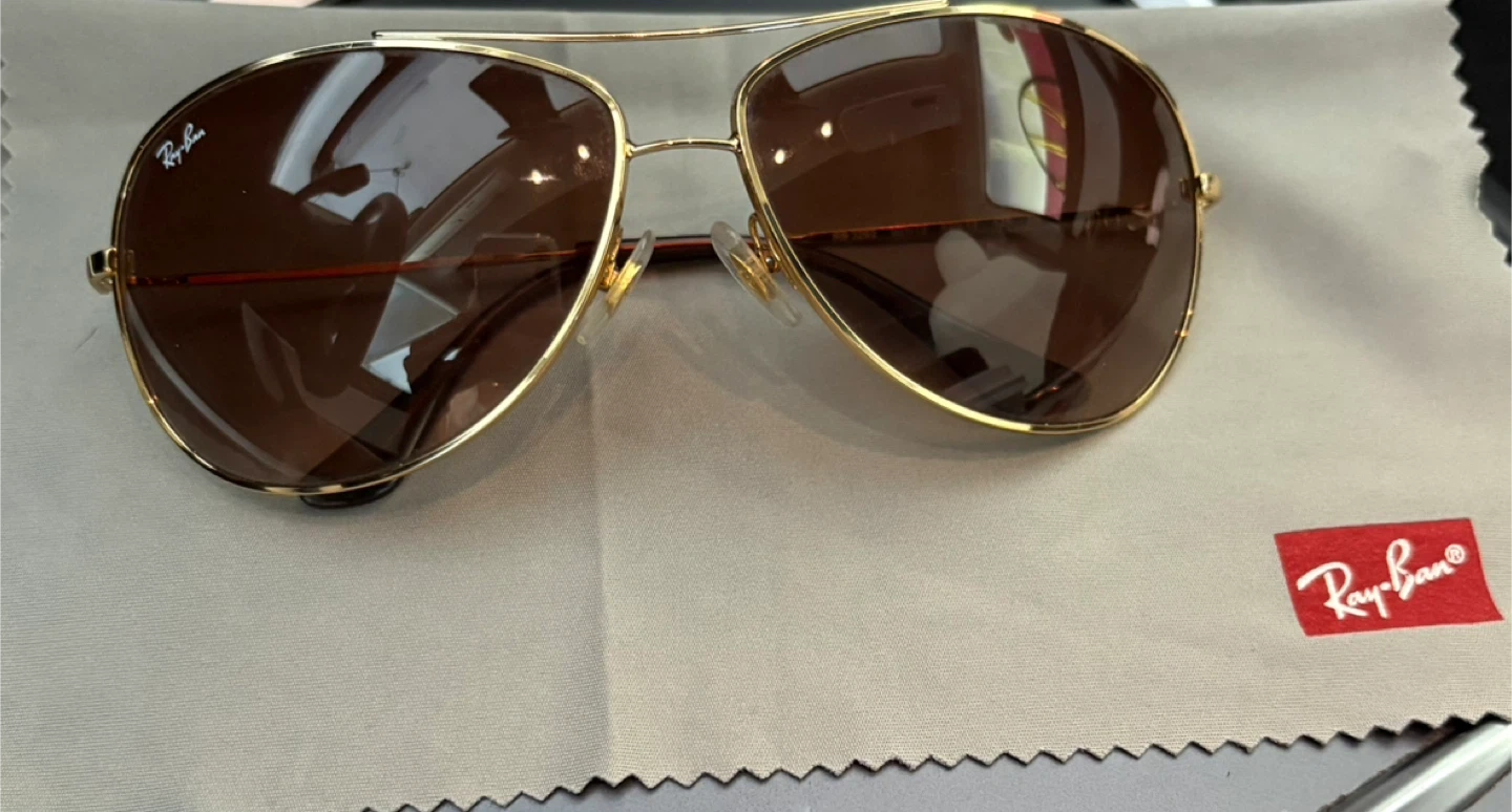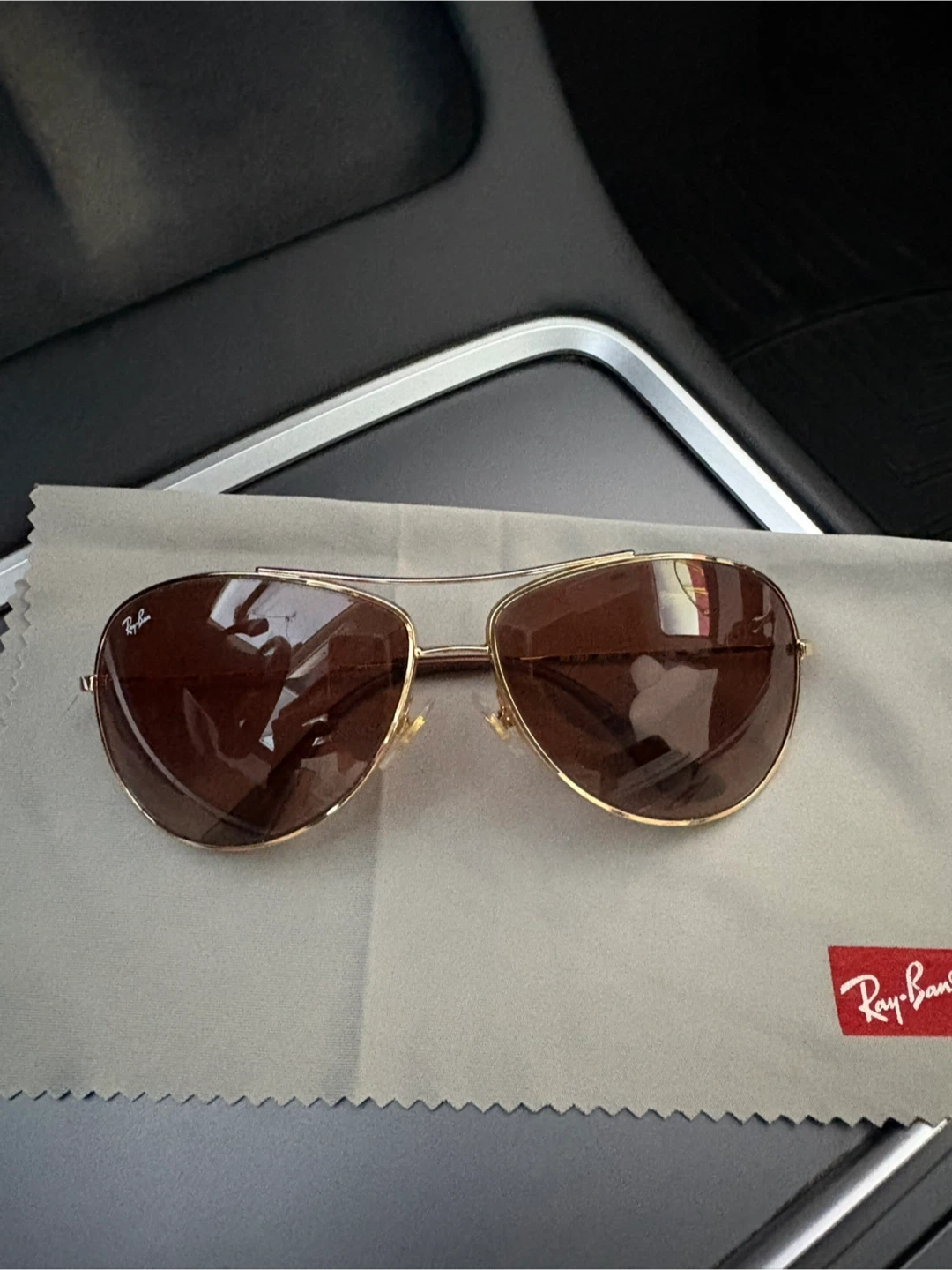 Selling a pair of classic Ray-Ban aviator sunglasses! They feature a stylish gold frame and brown lenses. Comes with the original Ray-Ban cleaning cloth.