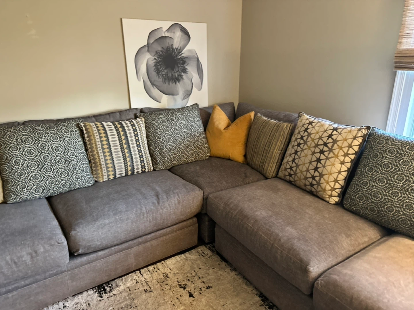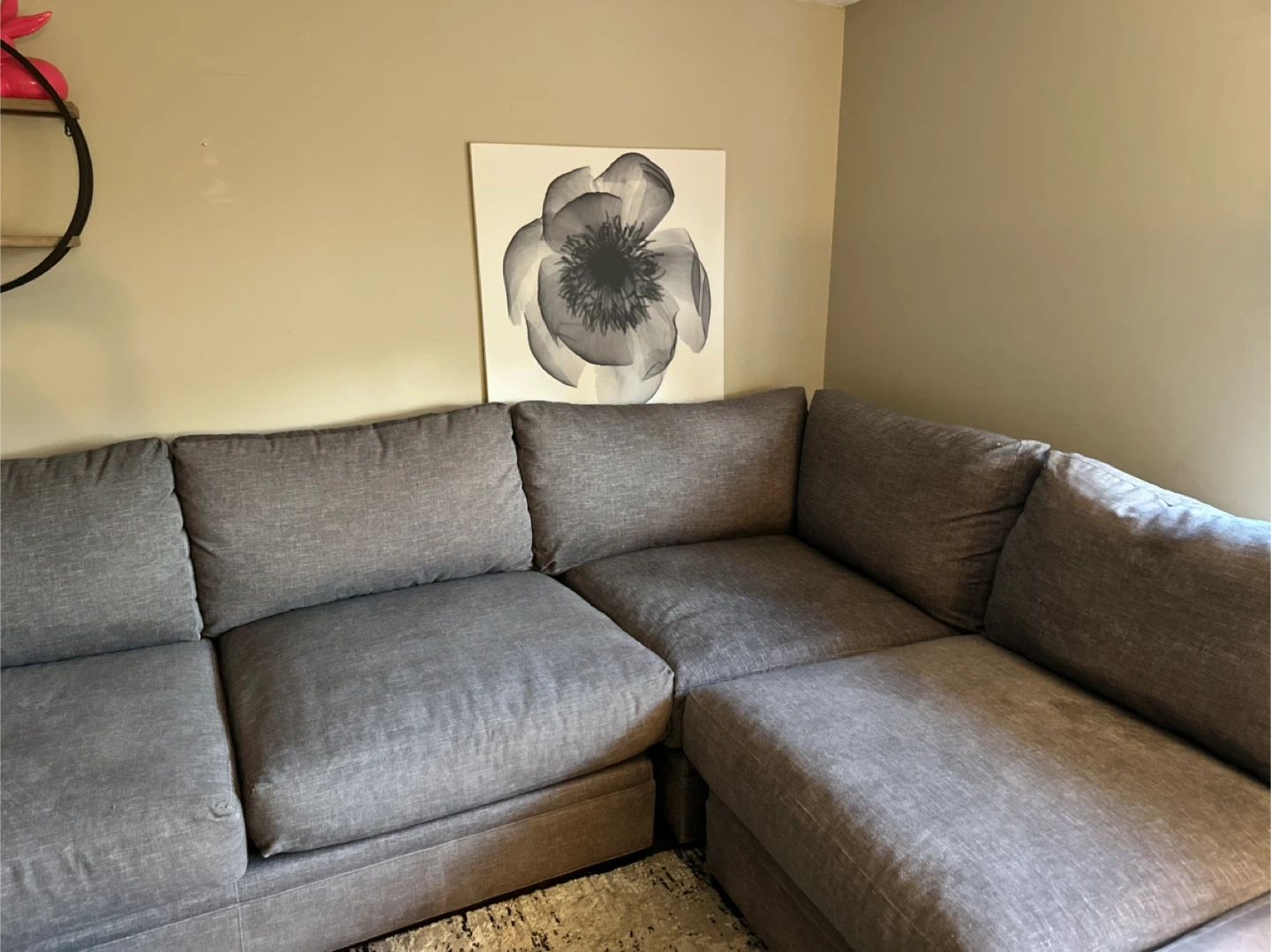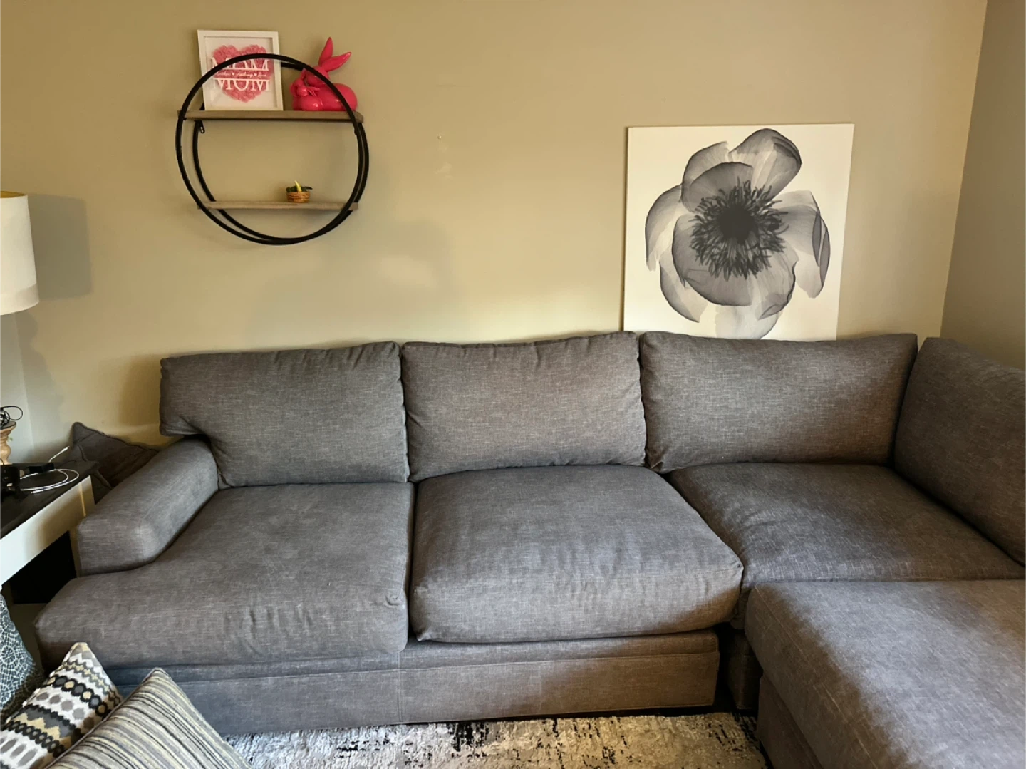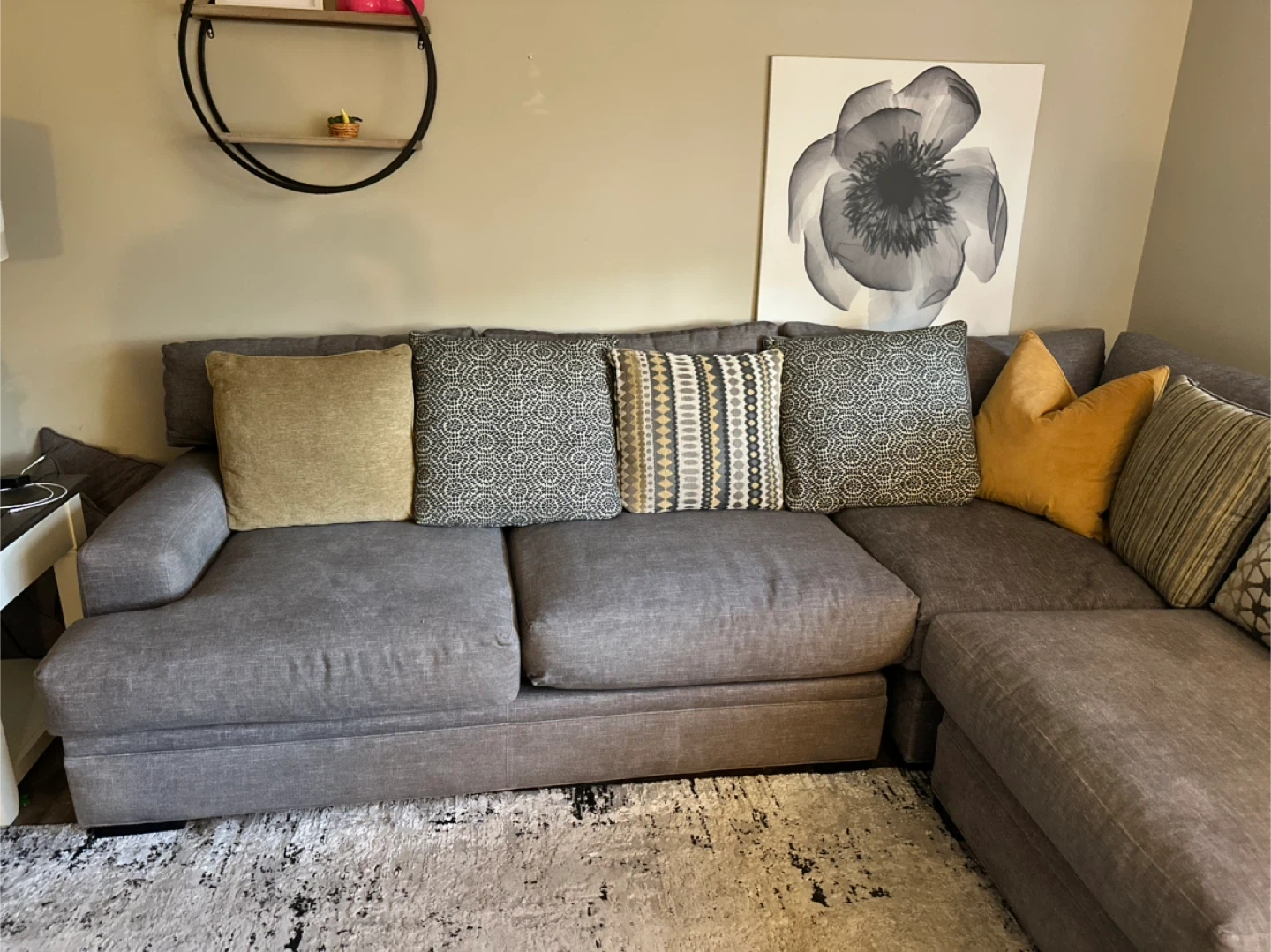 Selling a comfortable large gray sectional sofa! It's in good condition and ready for a new home. Perfect for a living room or entertainment space. Moving and it doesn’t fit our space.