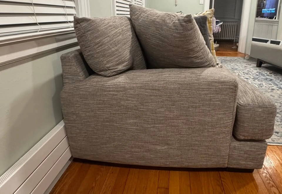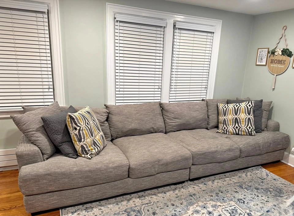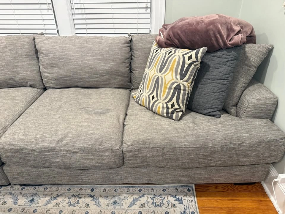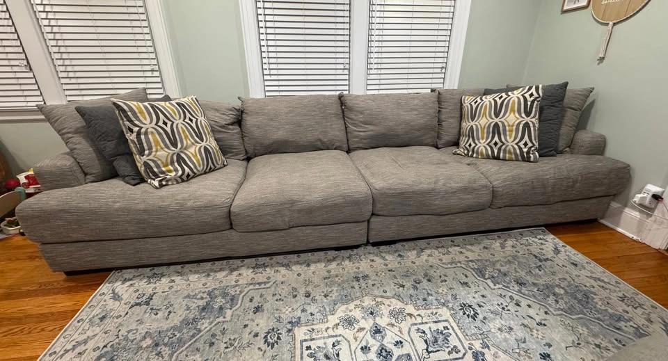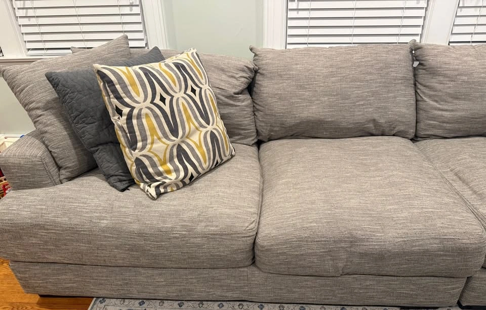 10Cozy, super-soft, and ready for a new home! Purchased from Raymour & Flanagan about 4 years ago — this Leighton 3-piece sectional has been well-loved in a family home with kids but is still in great shape. ✨ Details: Color: Neutral gray (goes with everything!) Includes 6 matching pillows – all covers are removable & washable Very soft, “mushy” feel – perfect for lounging or family movie nights Slight pilling from normal use, but no tears or stains Clean, smoke-free home 📏 Dimensions: Length: 140” Depth: 43” Height: 27” Will need to take it out on your own. It's two pieces.