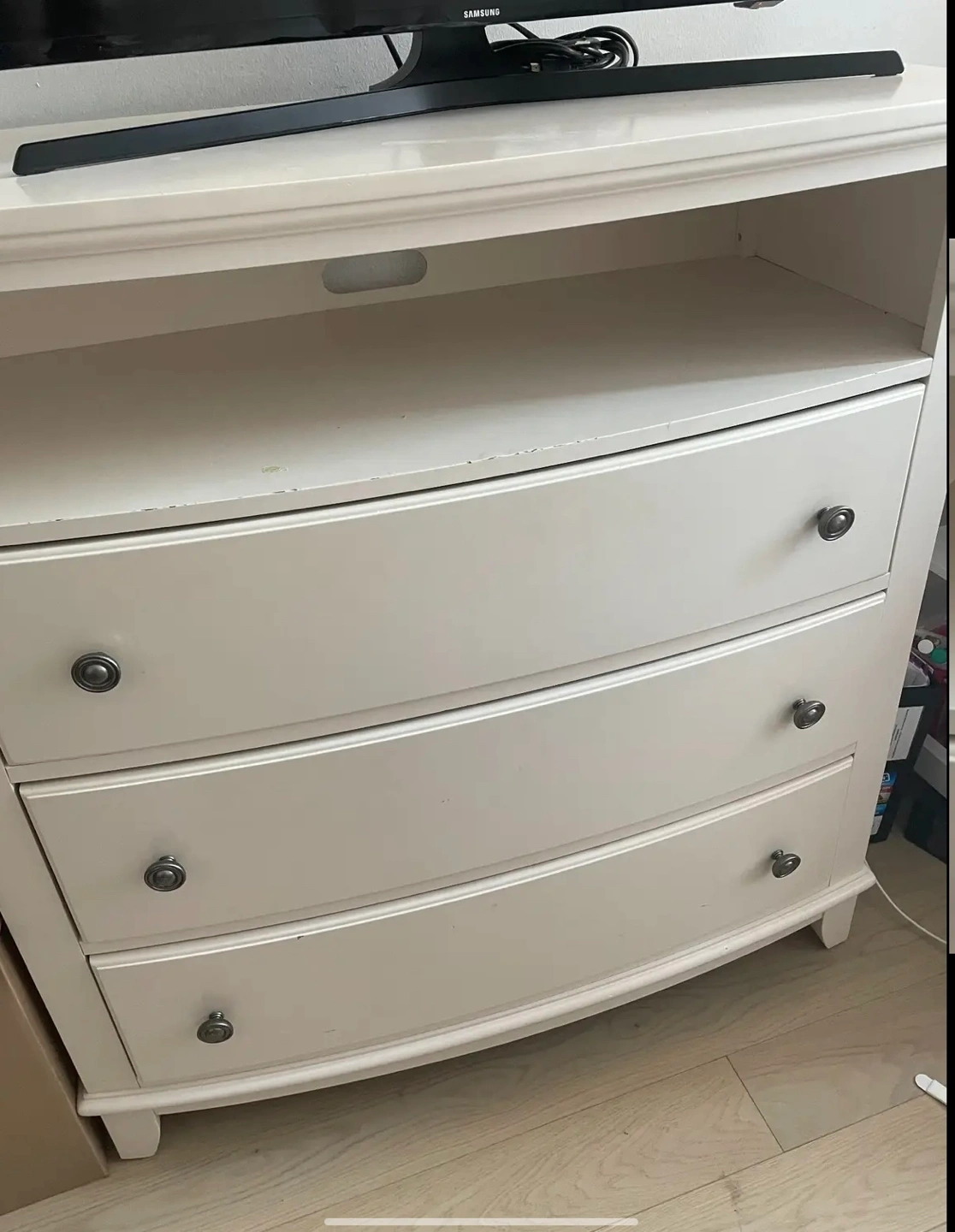 Raymour & Flanigan 3 drawer Media dresser. Cream color L: 40" x W: 18.5" x H: 42" https://offerup.co/faYXKzQFnY?$deeplink_path=/redirect/ Pick up in Hell’s Kitchen elevator building by Sunday 6/11