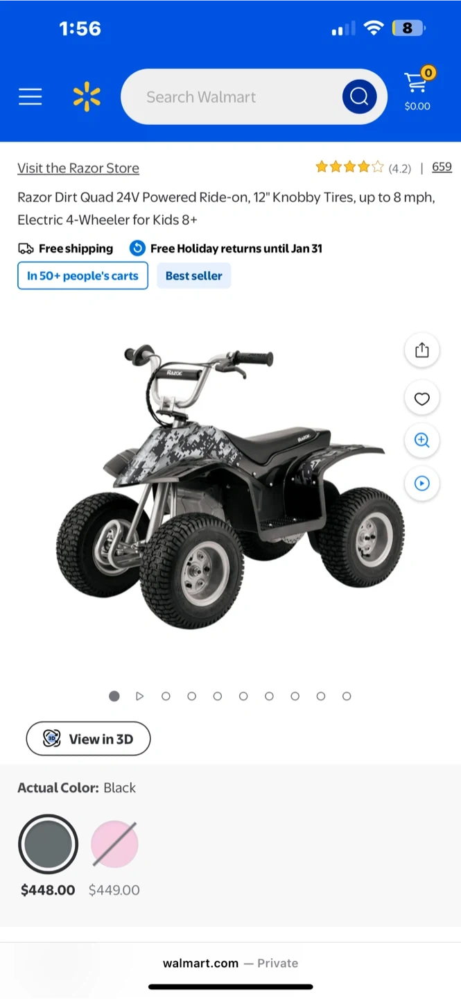 Selling a Razor Dirt Quad 24V Powered Ride-on, perfect for kids 8 and up! It features 12" knobby tires and can reach speeds up to 8 mph. The actual color is black. A fun and safe way for kids to explore!