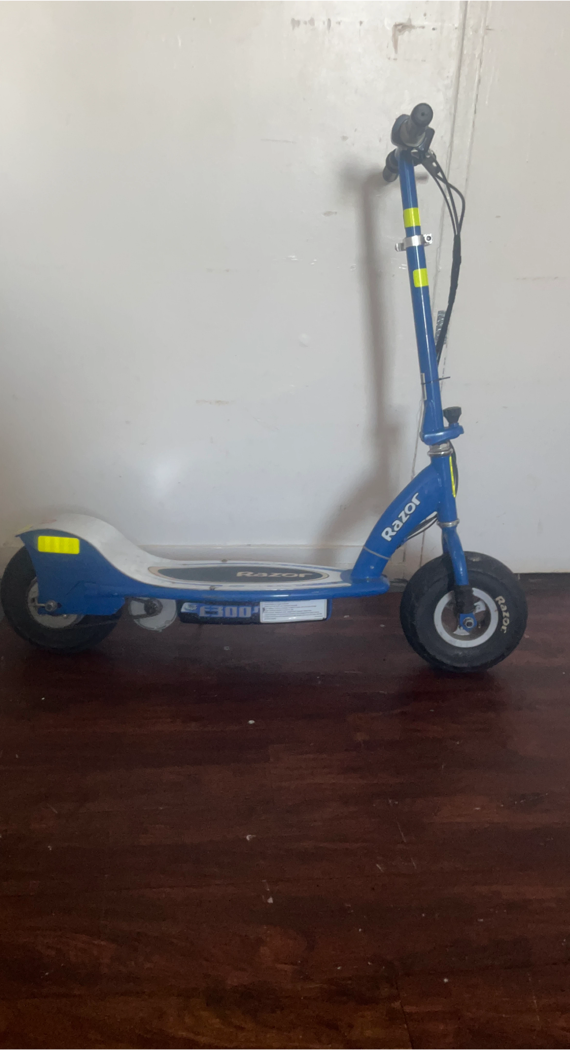 94Selling a blue Razor E300 electric scooter. It has some signs of use but still works great! Perfect for getting around town.(Just need a charger cost about $10 on Amazon)๐