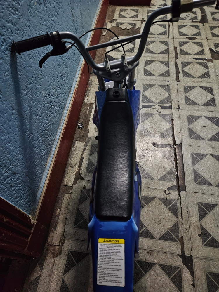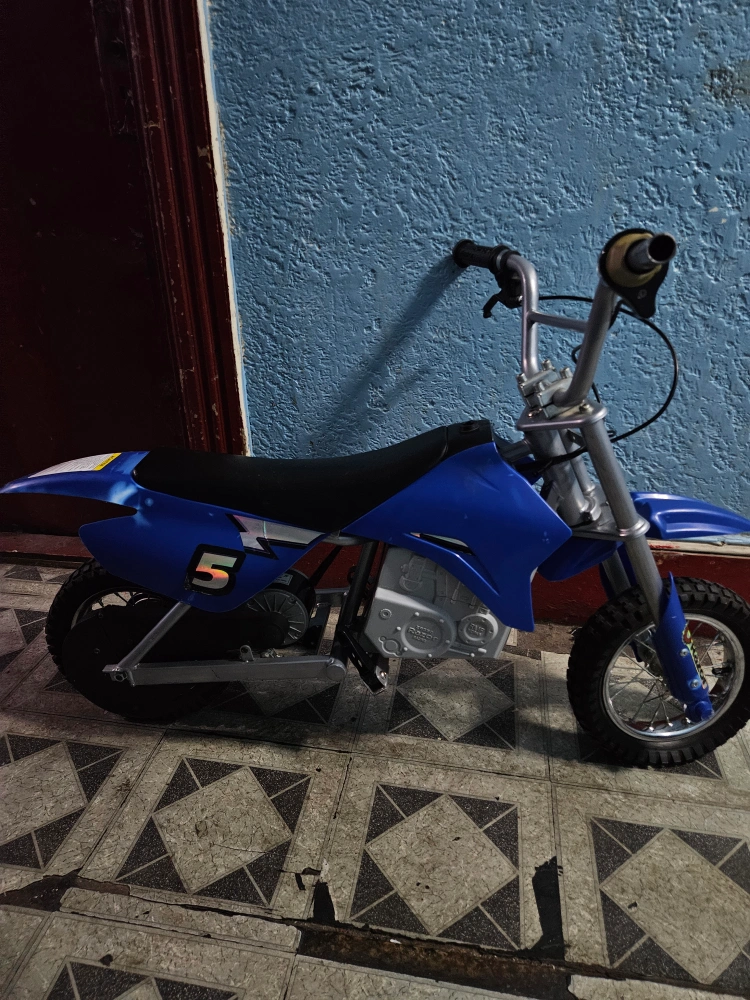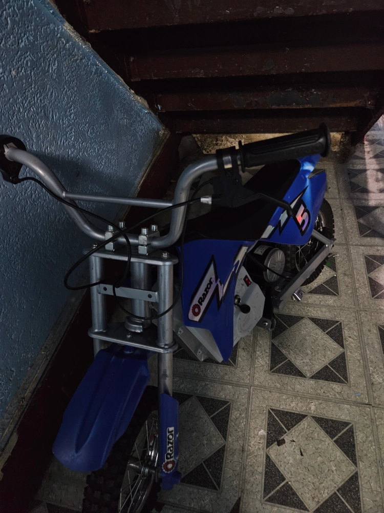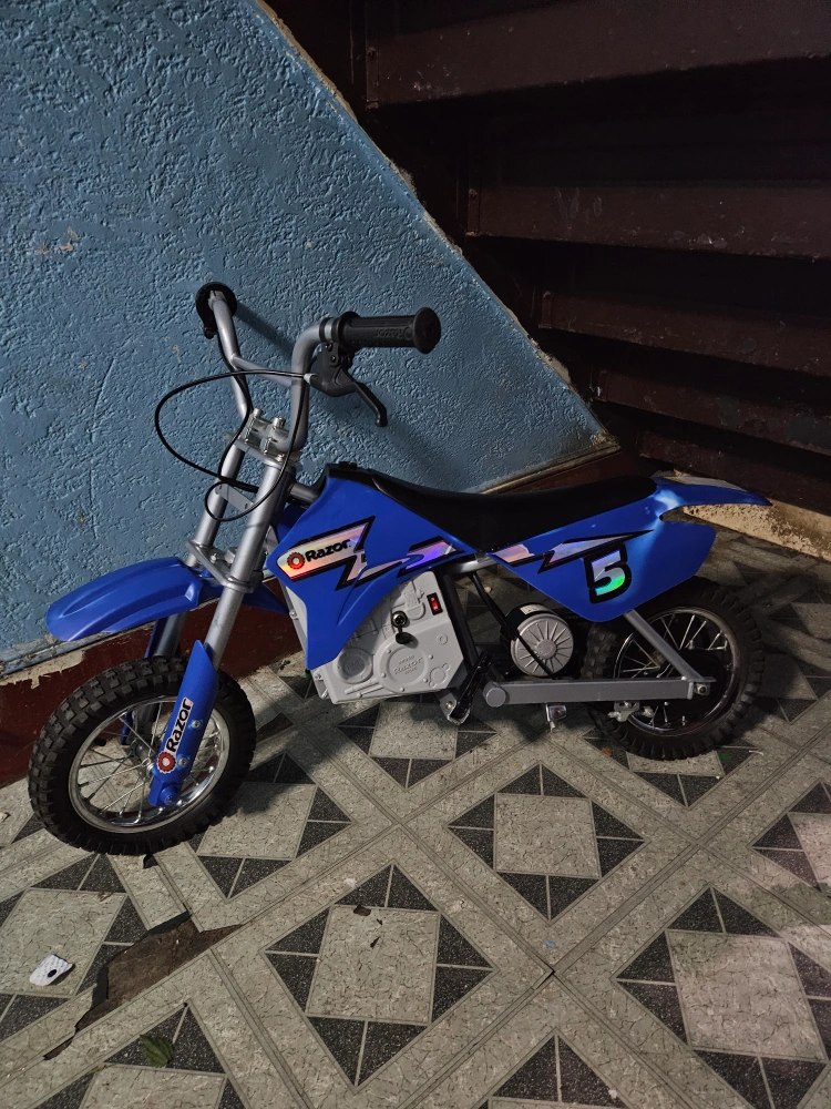 Kids electric dirt bike. Blue and silver. Looks like it's in good condition. Includes battery and charger.