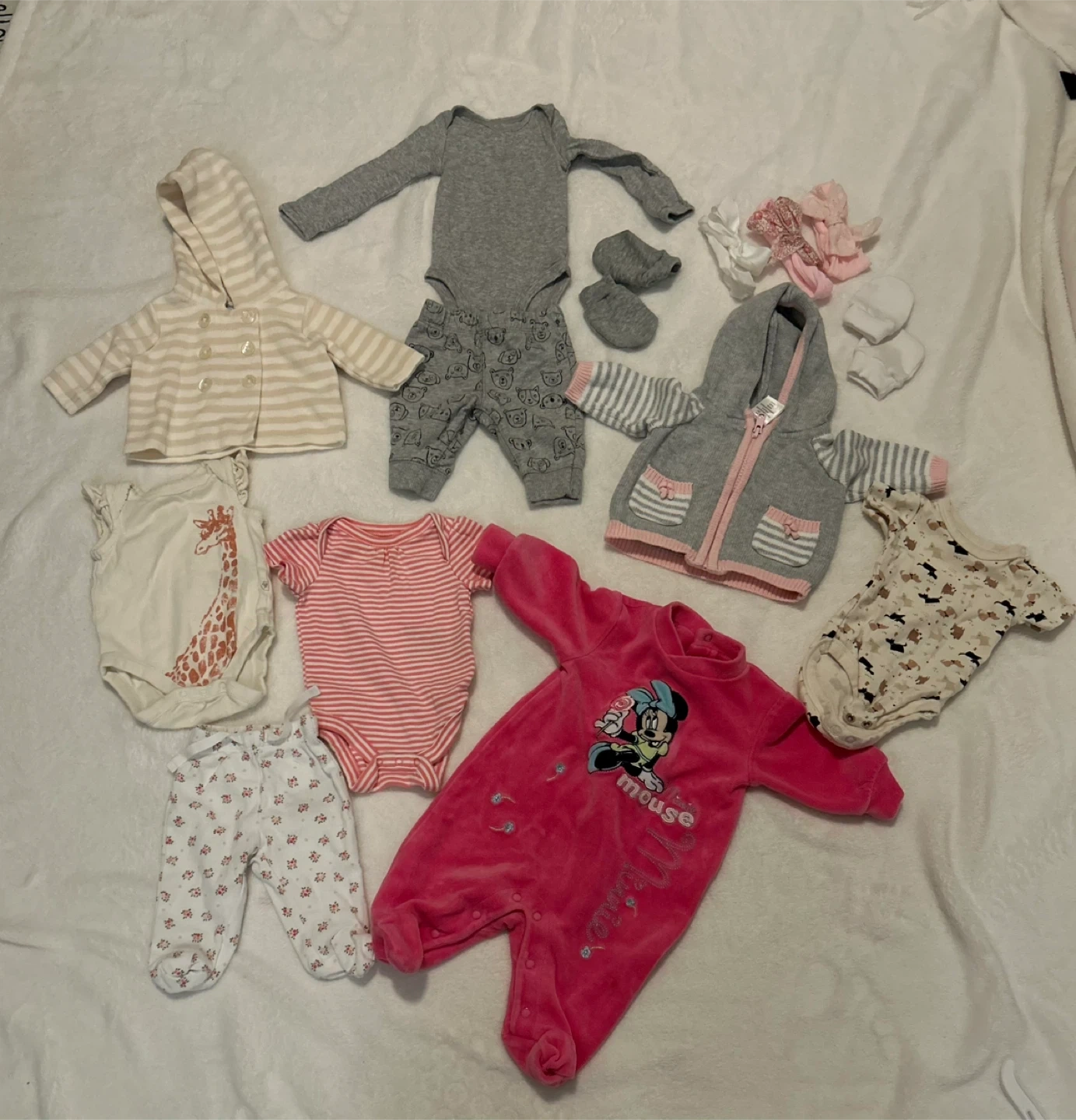 Selling a cute bundle of baby clothes! Includes a variety of items like onesies, pants, and a couple of jackets. All in great condition and ready for a new little one