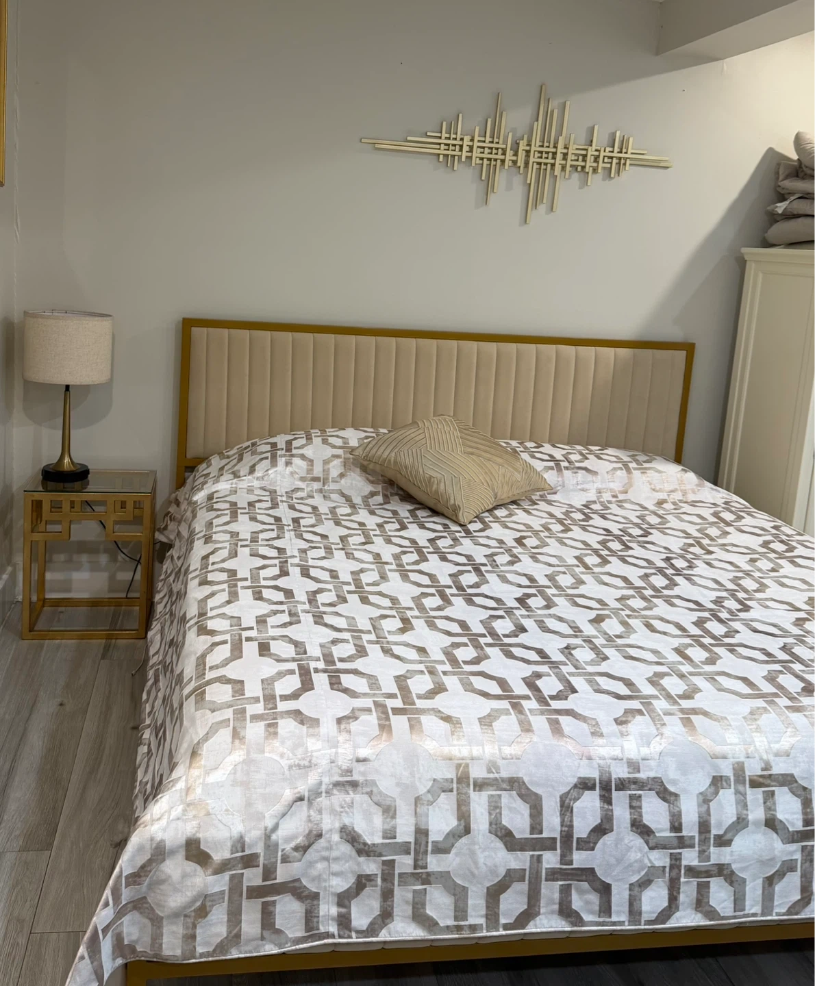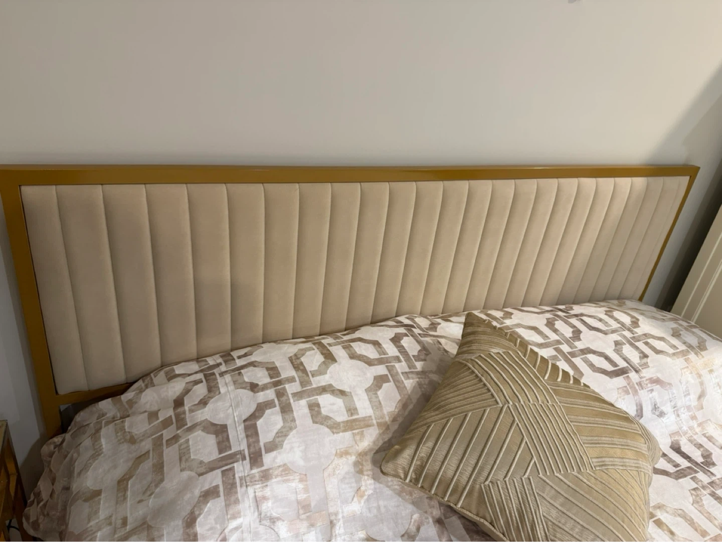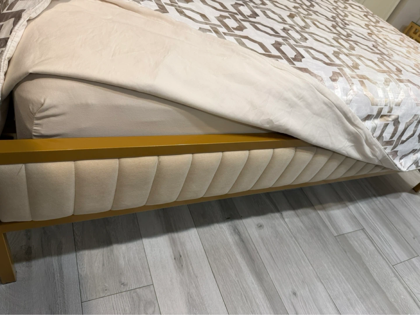 Stylish bed frame featuring a gold metal frame with beige velvet upholstered side rails and headboard. Mattress included if needed.