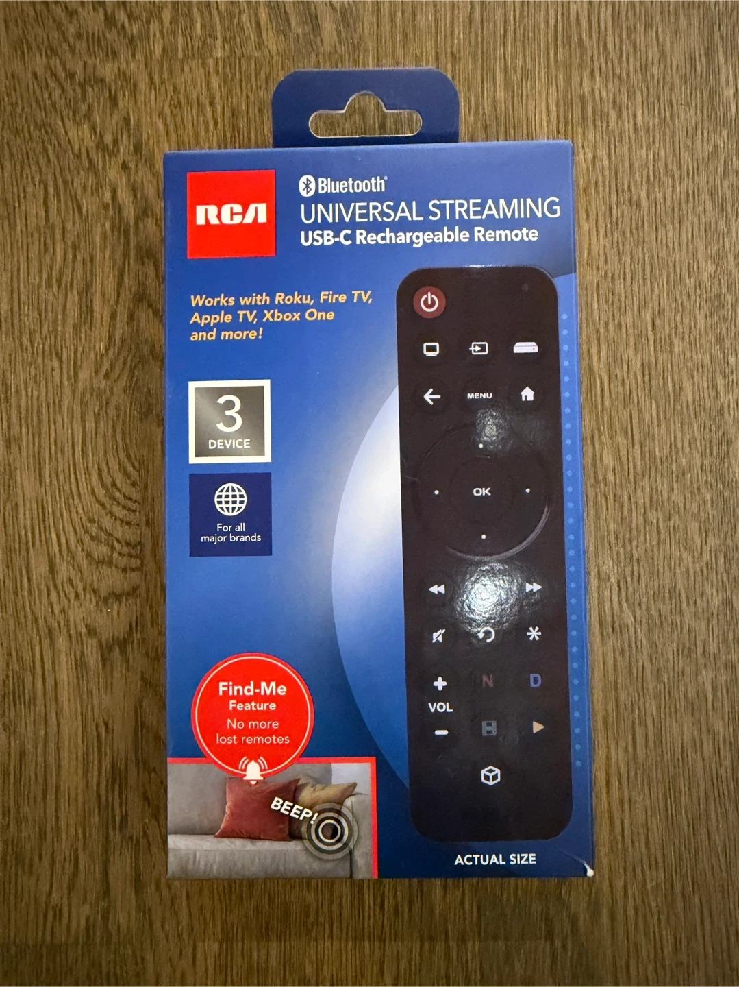 Brand new RCA Bluetooth remote compatible with Roku, Fire TV, Apple TV, Xbox One, and more! Rechargeable via USB-C and includes a “Find-Me” feature so you’ll never lose your remote again. Controls up to 3 devices and works with all major brands. 💡 Perfect for streamers and home entertainment setups!