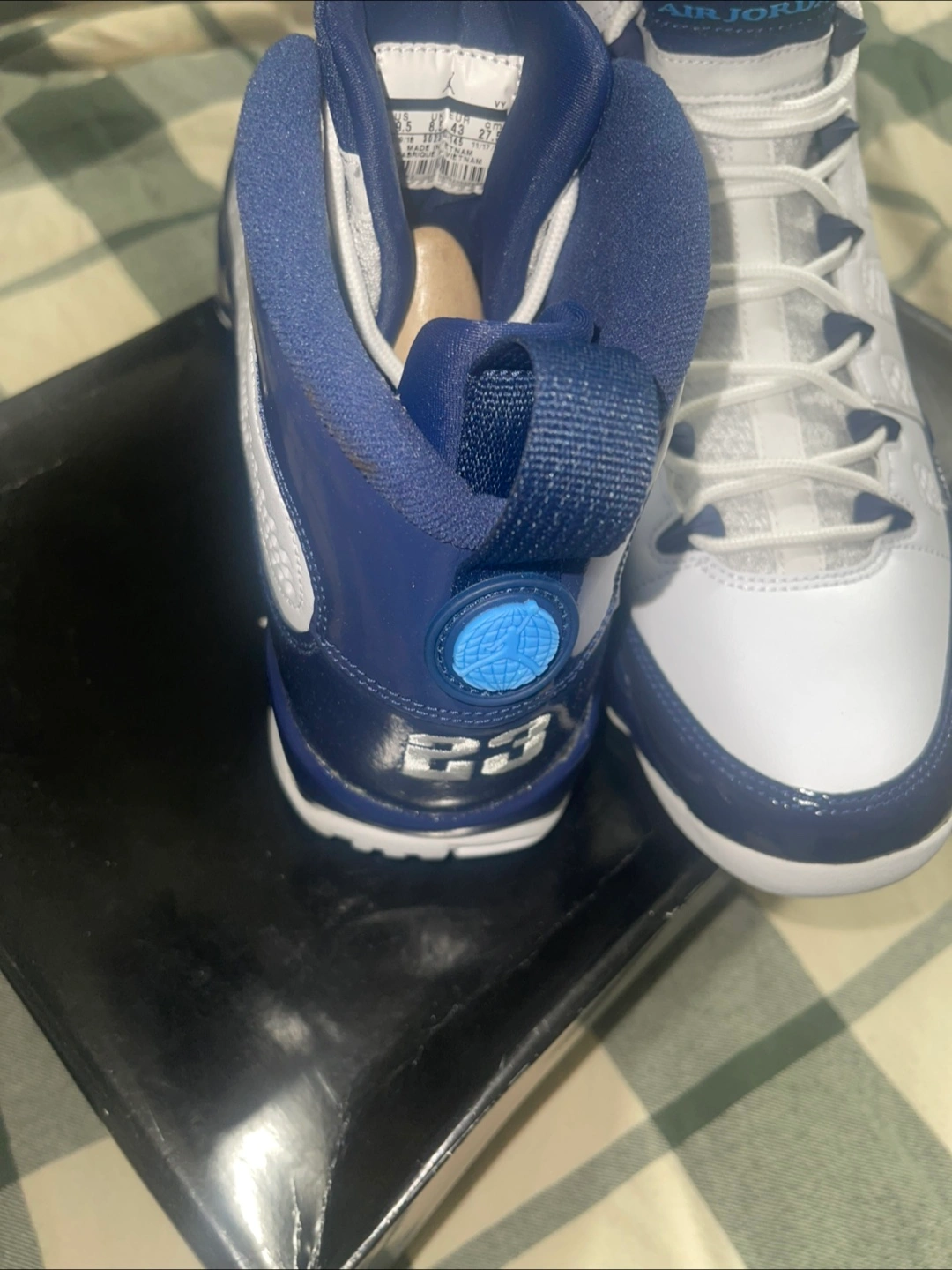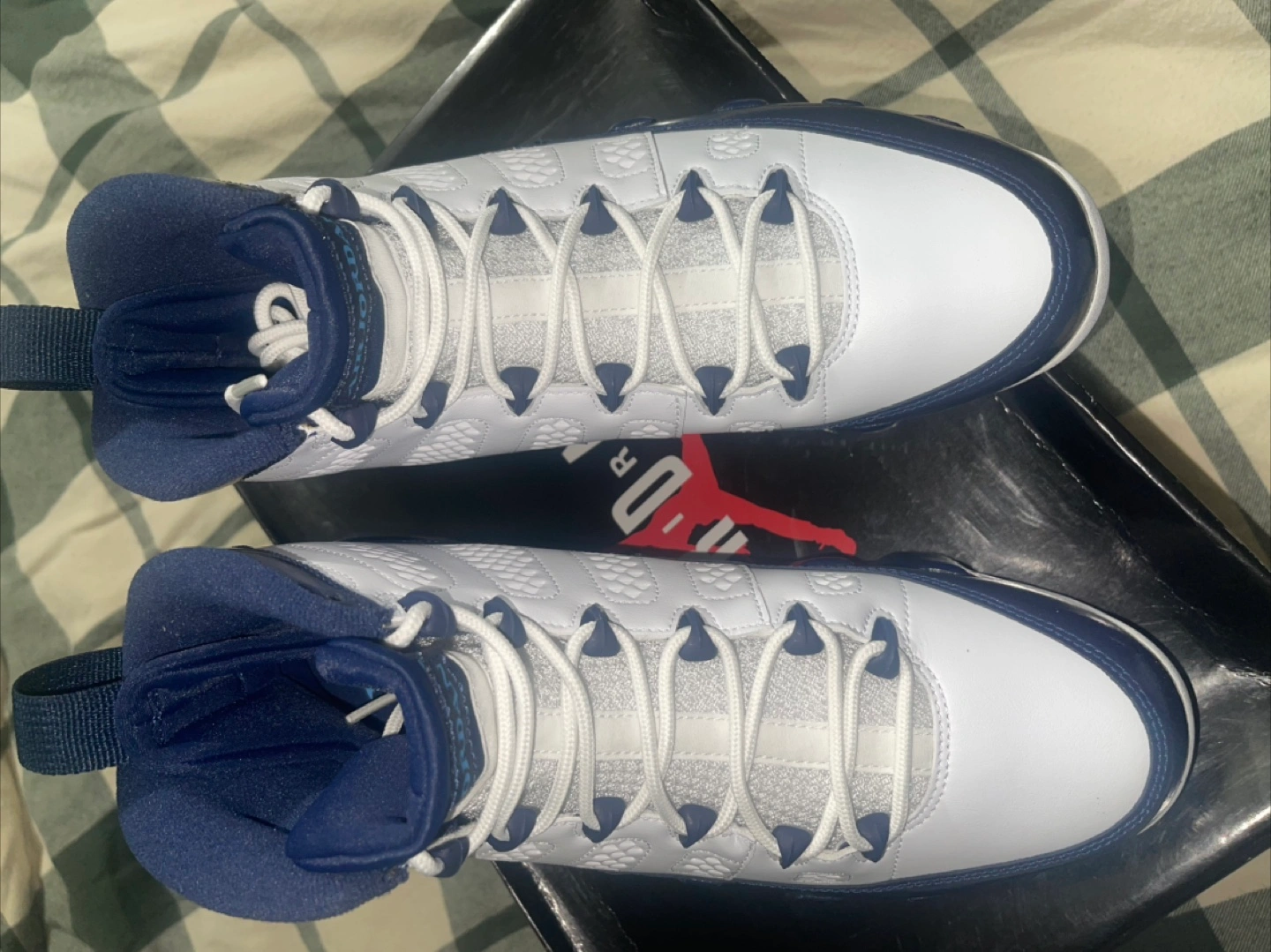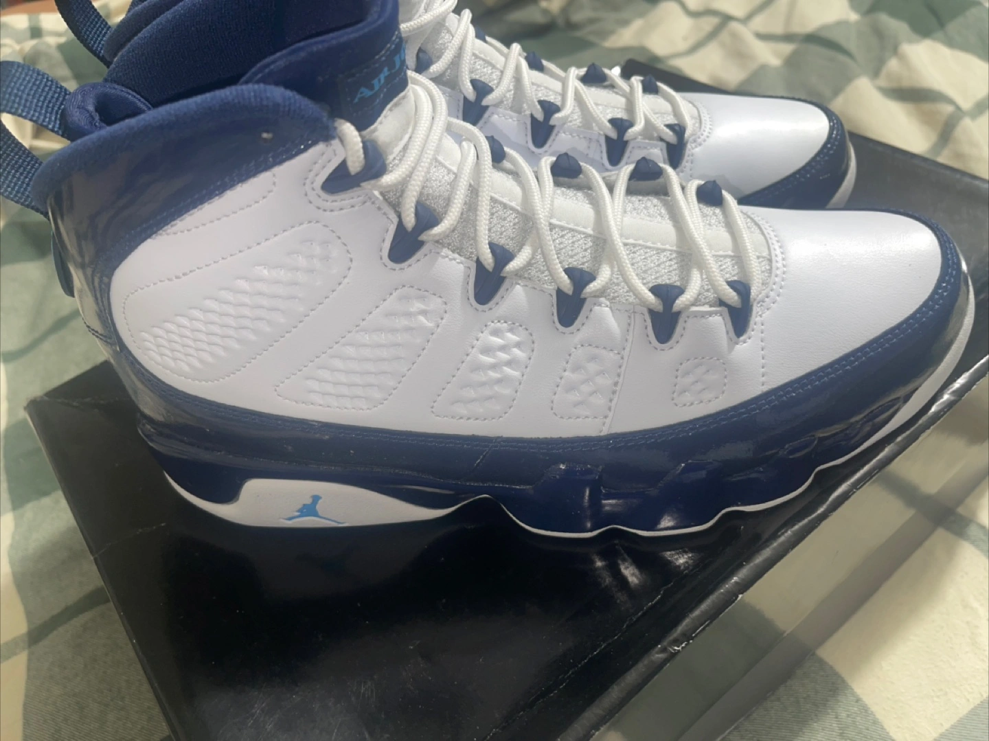 Selling a pair of Air Jordan 9 Retro sneakers in white and navy! They are a US size 9.5. These shoes are in good condition and come with the original box