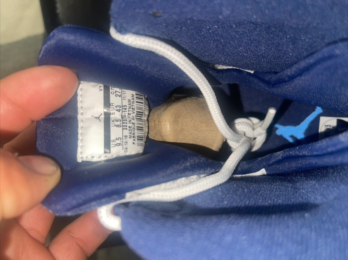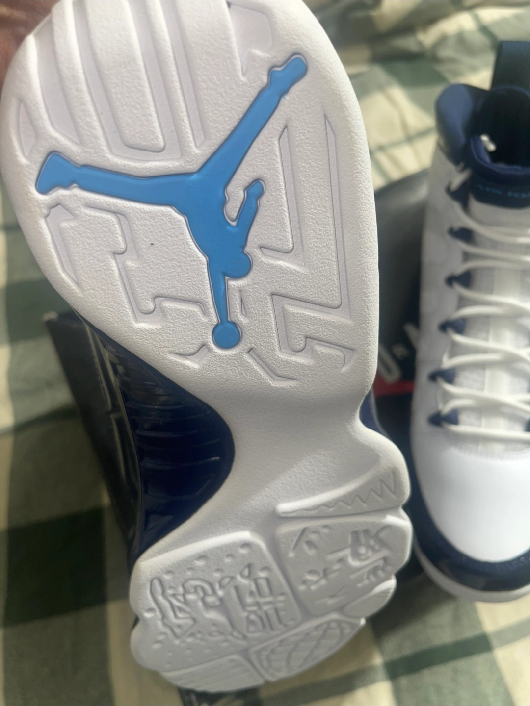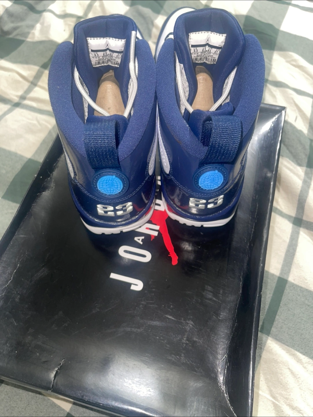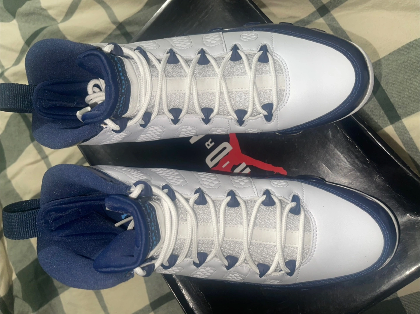 Selling a pair of Air Jordan 9 Retro sneakers in white and navy! They are a US size 9.5. These shoes are in good condition and come with the original box