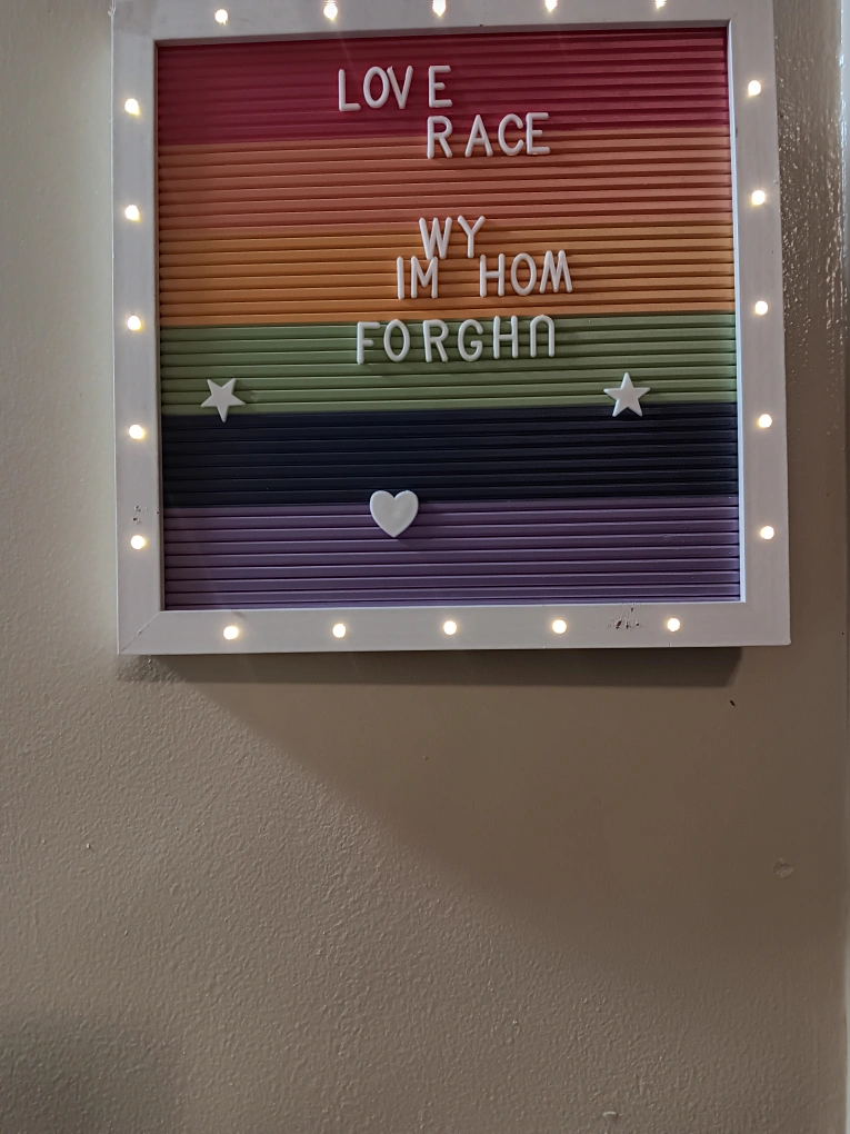A letterboard with a rainbow striped background. White frame with little lights on the outer edge. It comes with white letters, two stars, and a heart. You can add this to a room to personalize your space and let your creativity flow.