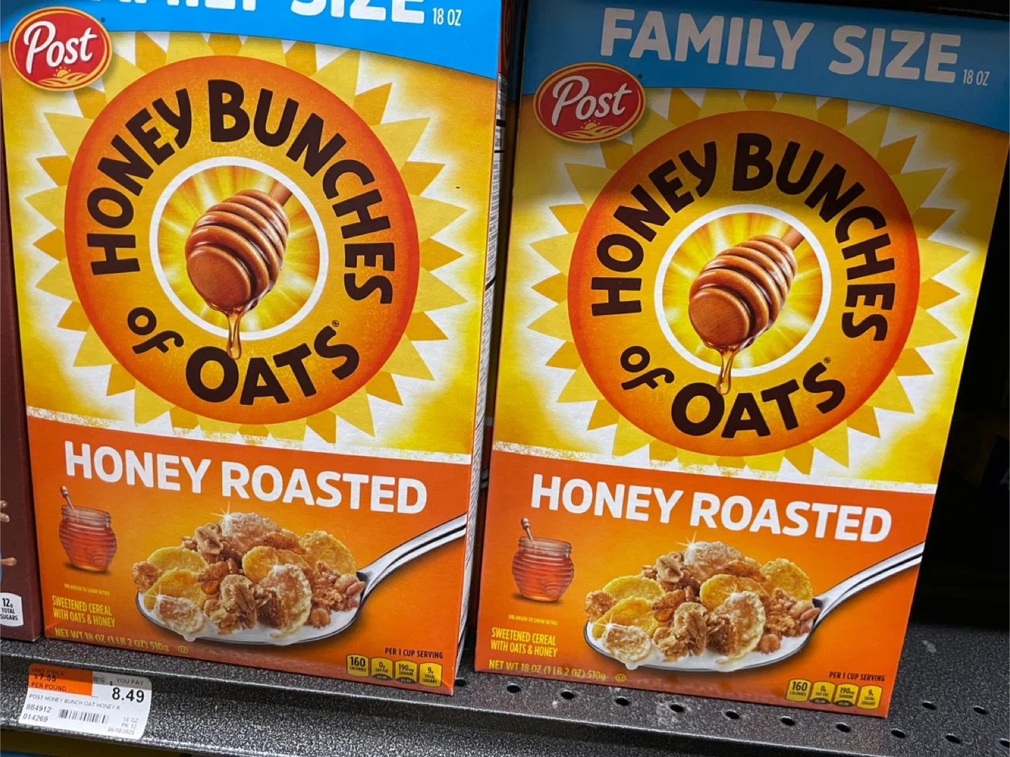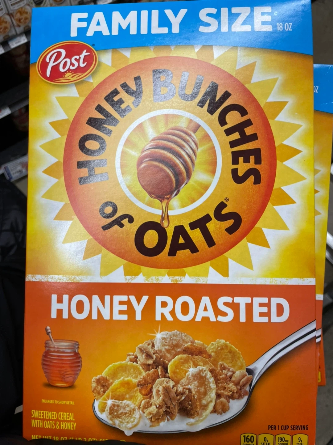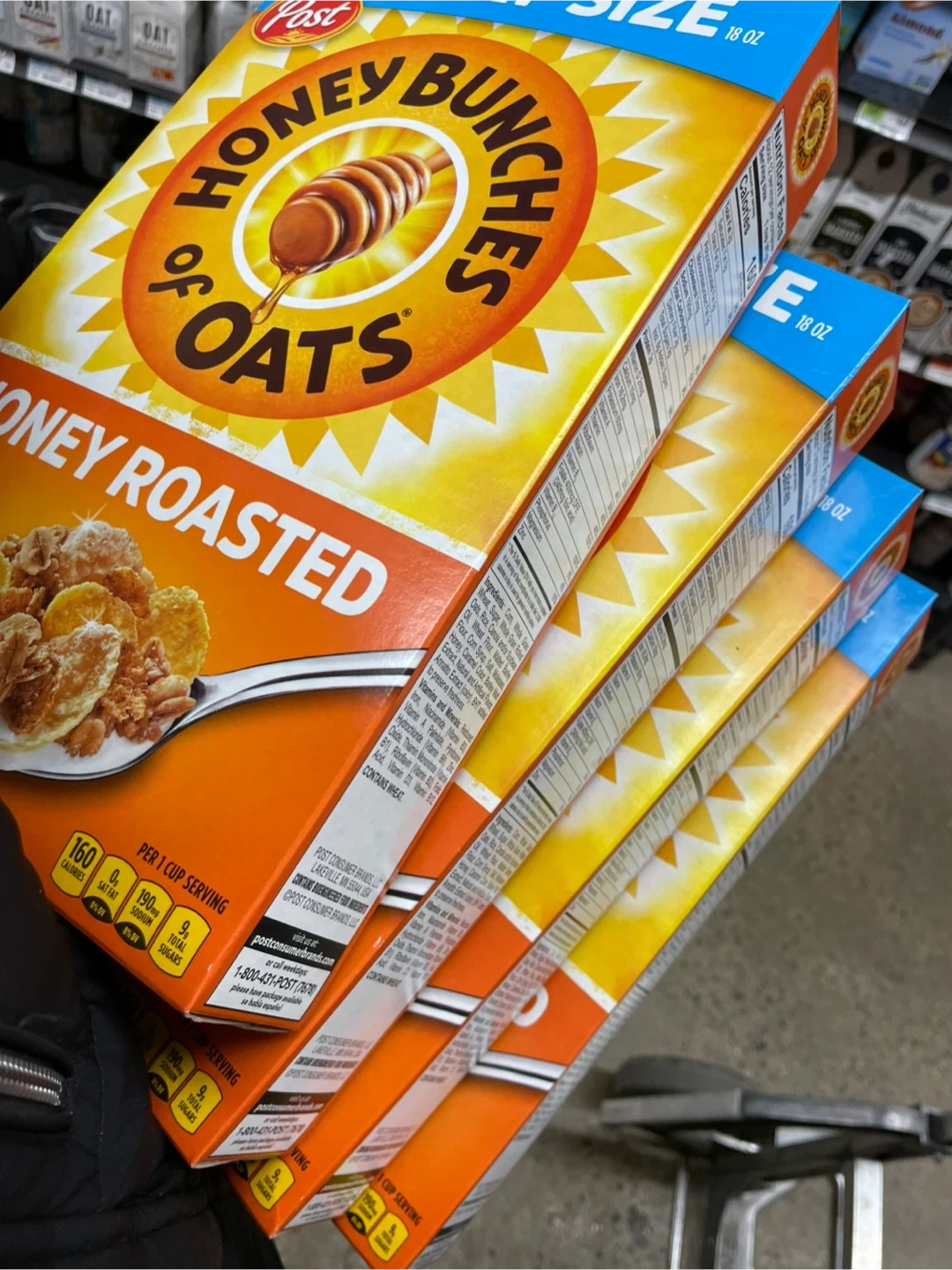 4 boxes Jumbo size Post Honey Bunches of Oats Honey Roasted cereal is a sweet and crunchy breakfast option. Each box contains 18 oz of sweetened cereal with oats and honey. It's a family-size box perfect for starting your day!