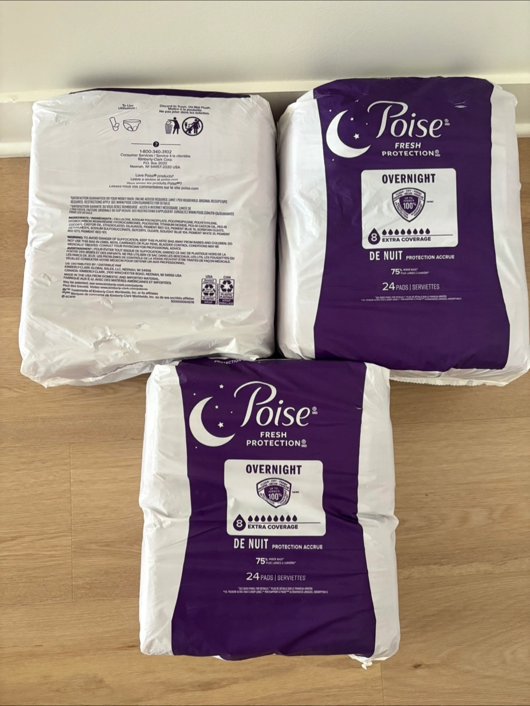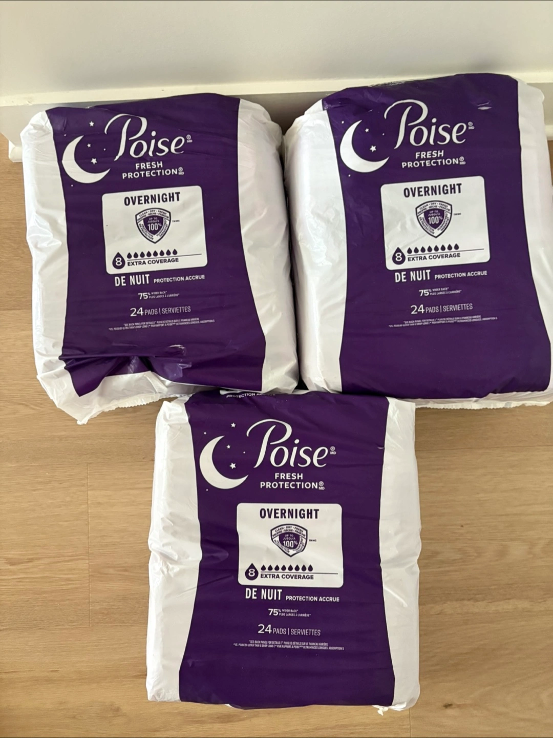 Selling 2 packs of Poise Overnight Pads. Each pack contains 24 pads with extra coverage for overnight protection. Great for comfort and security!