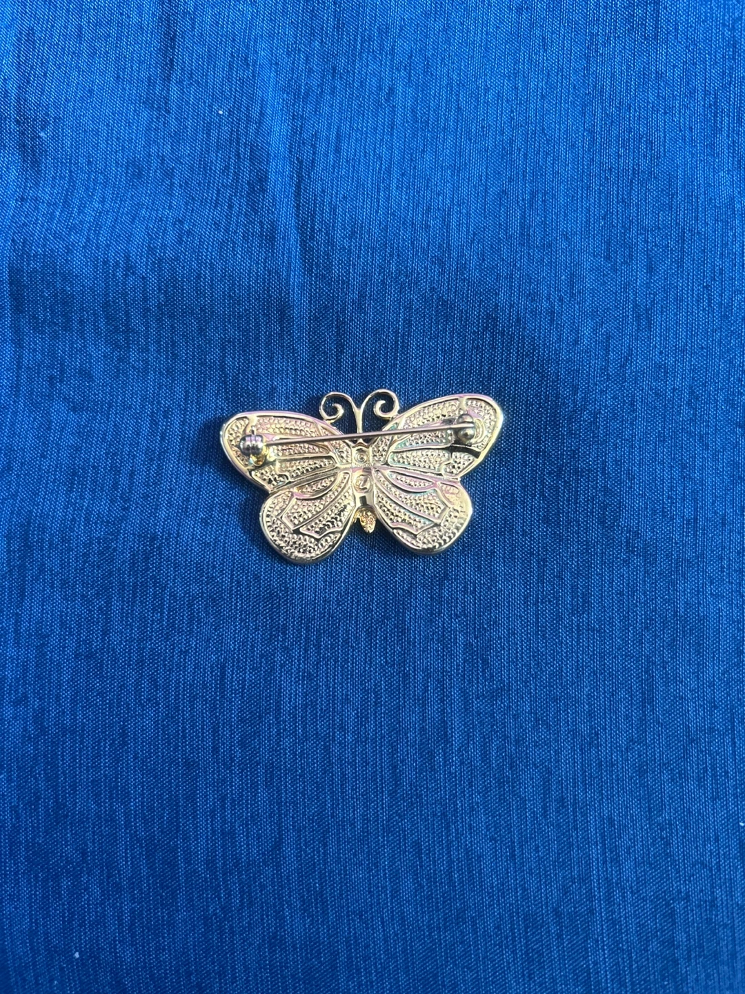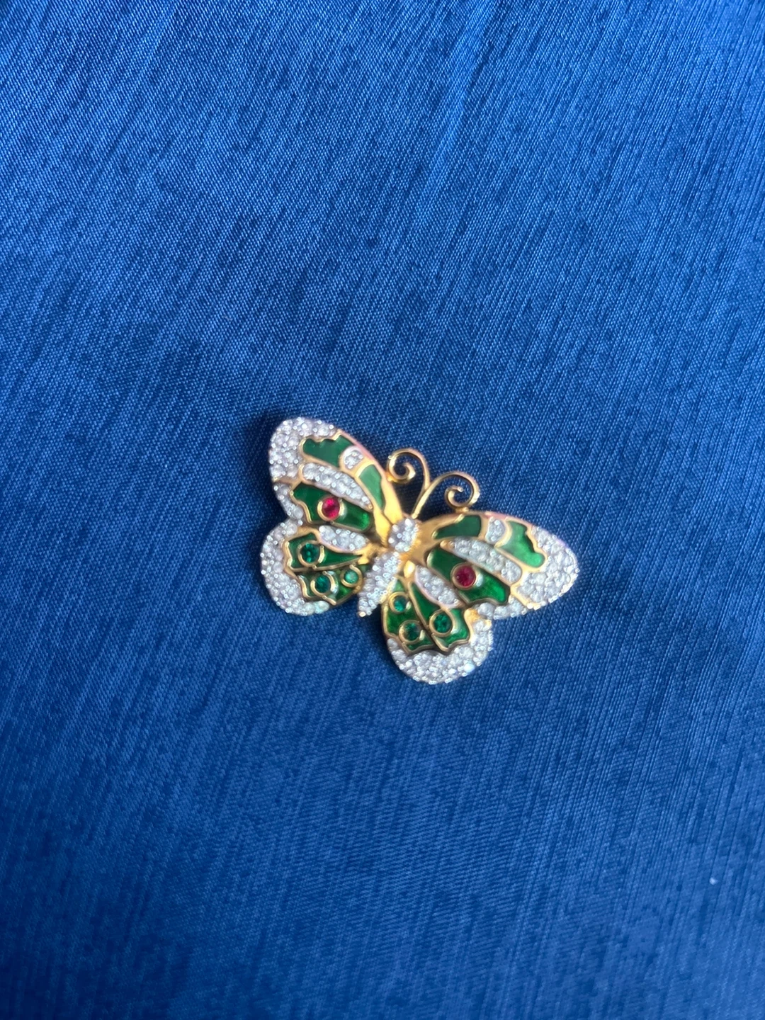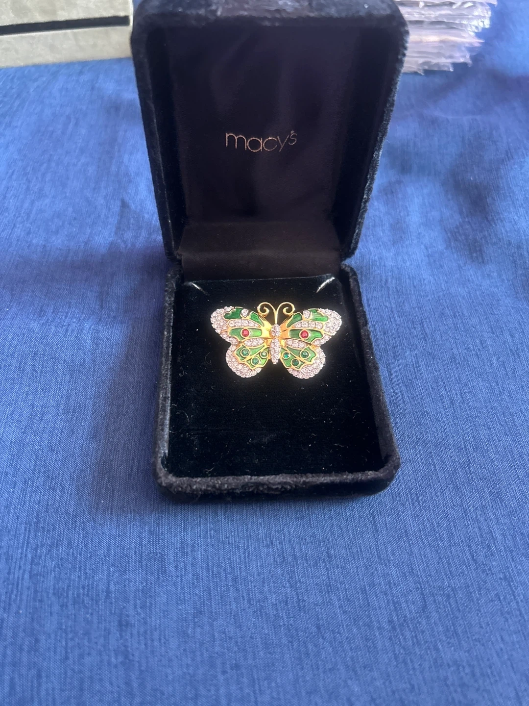 This Macy's butterfly brooch features colorful enamel and sparkling rhinestones. It's set in a gold-tone metal. Comes with its original velvet box. Great for adding a touch of charm to any outfit!