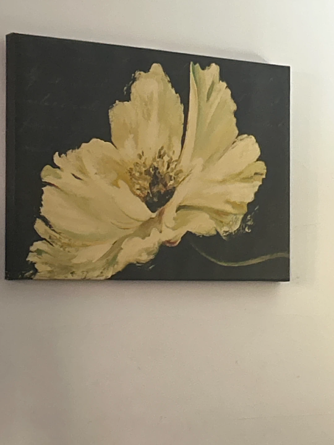 Canvas print featuring a large yellow flower on a dark background. The artwork measures approximately 24x18 inches. It's ready to hang and adds a touch of floral beauty to any room. This piece would look lovely in a living room or bedroom.