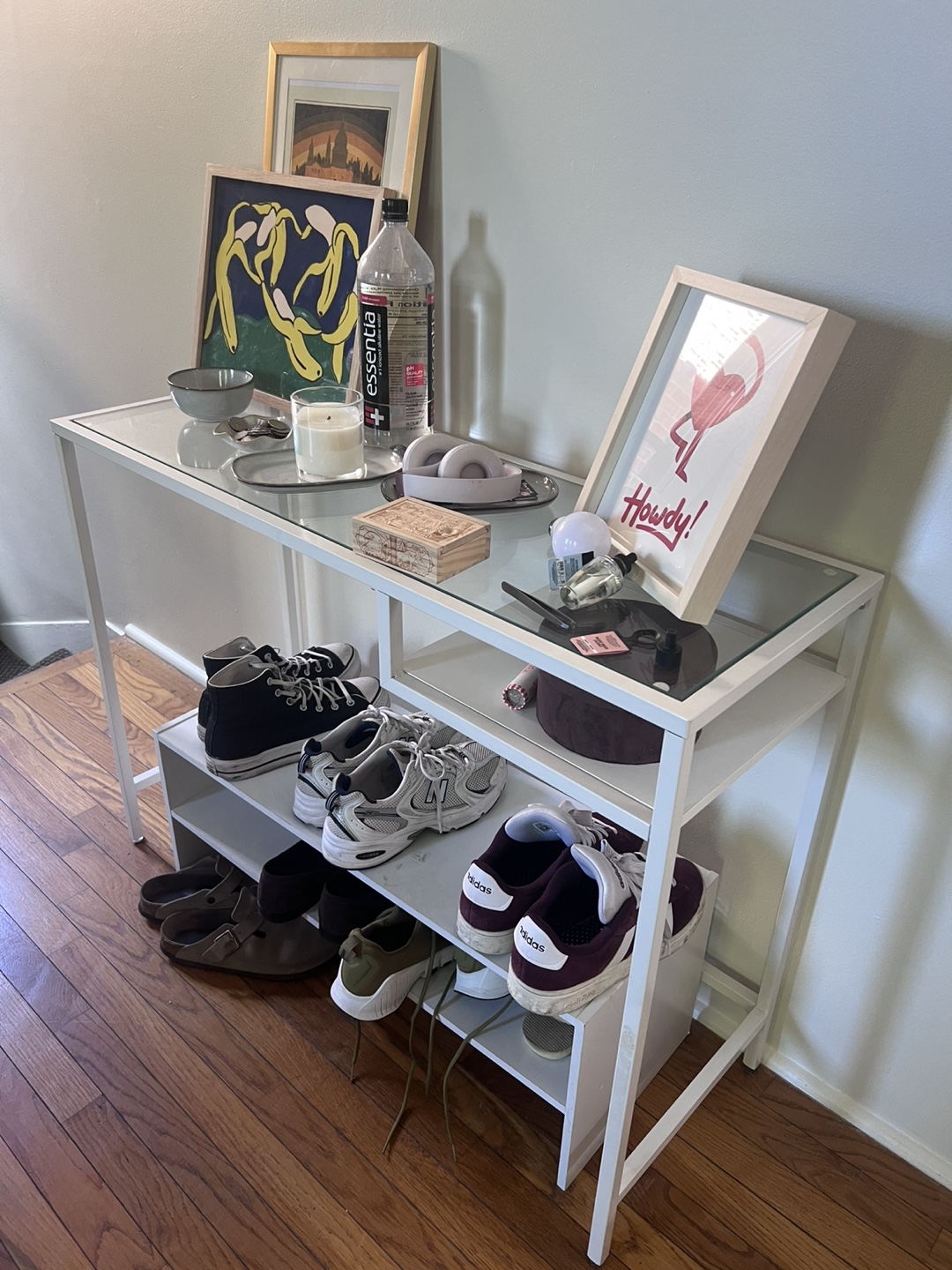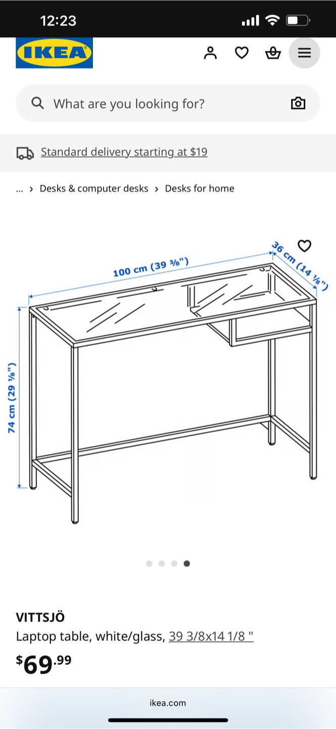 Selling an IKEA VITTSJÖ laptop table in white and glass. It measures 39 3/8x14 1/8 ". It's in great condition and ready for a new home! Originally bought for $69.99