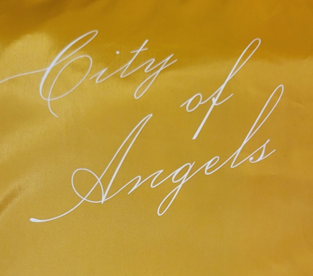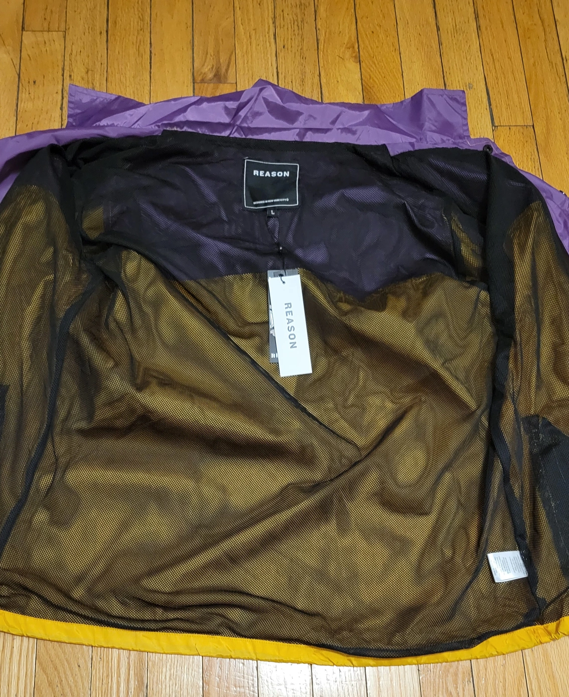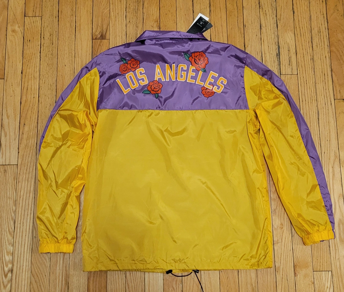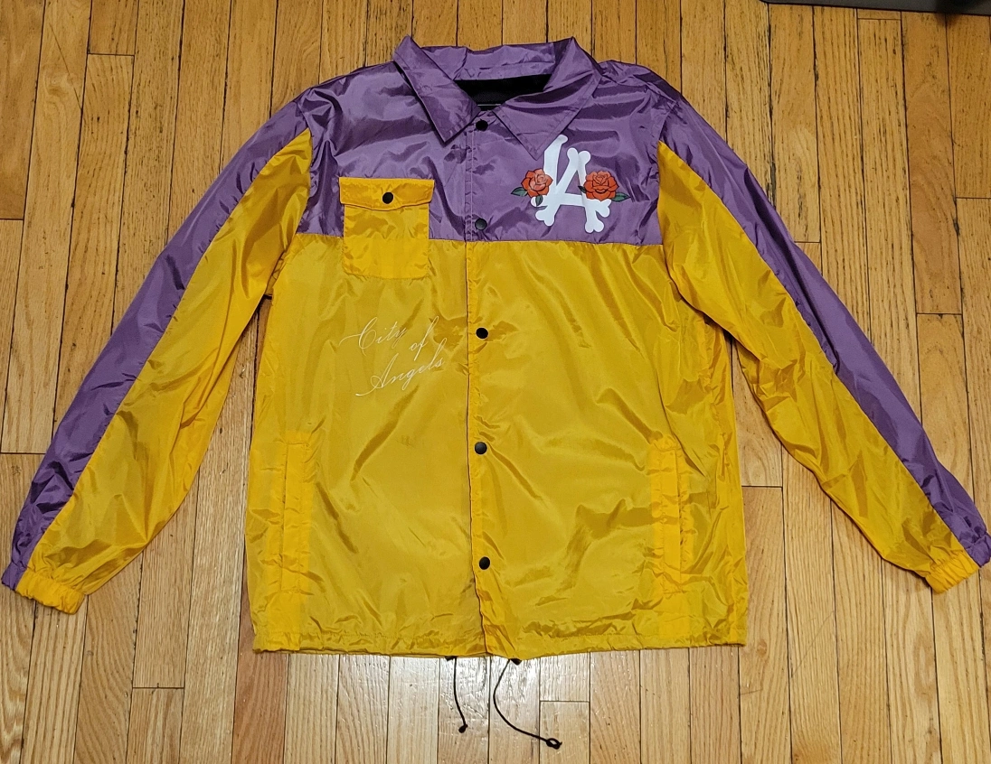 Selling a Reason brand jacket featuring a Los Angeles "City of Angels" design. The jacket is size L and has a unique color combination of purple and yellow. It's in great condition and ready for a new home!
