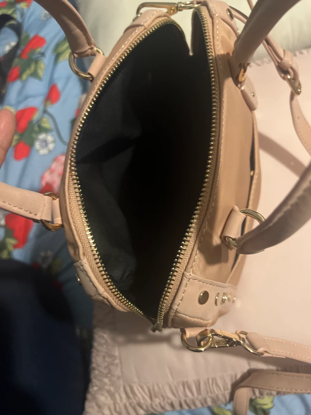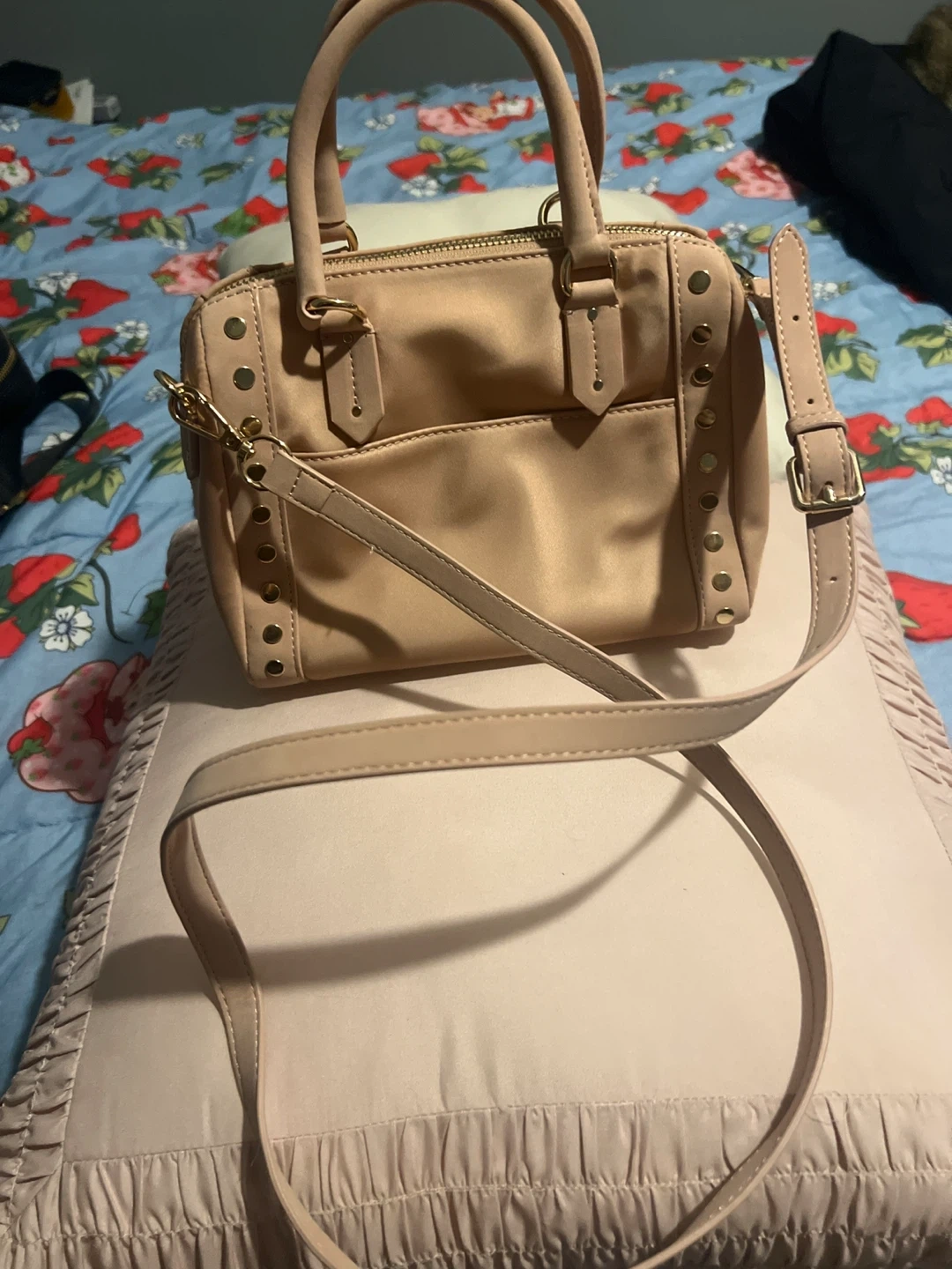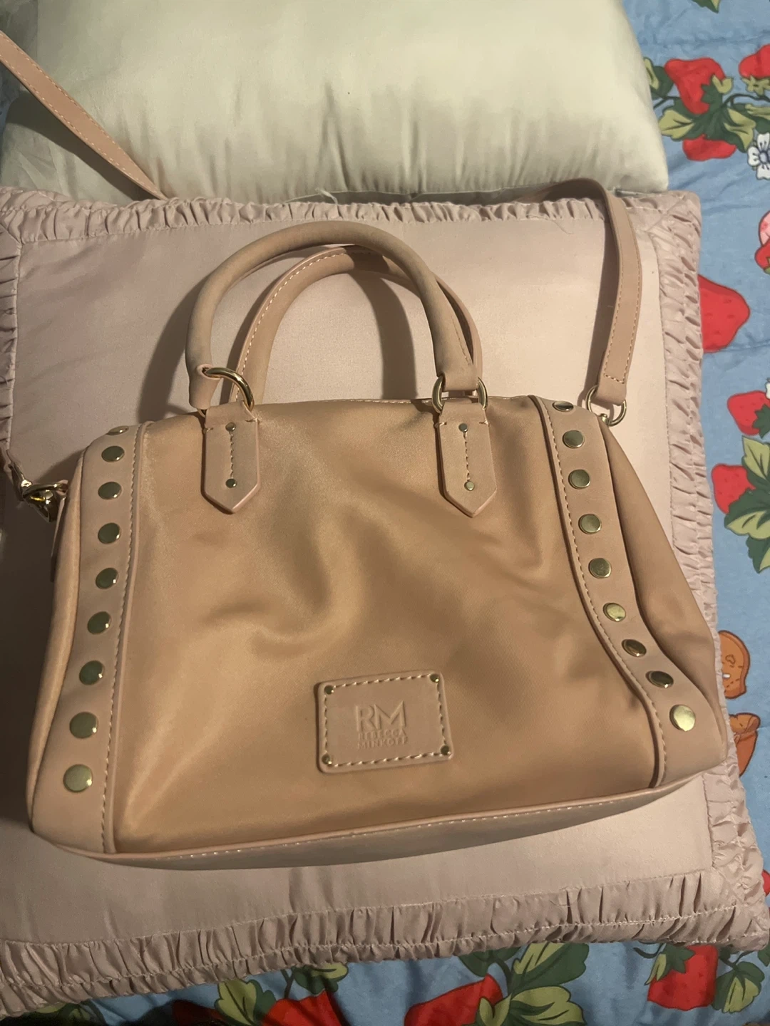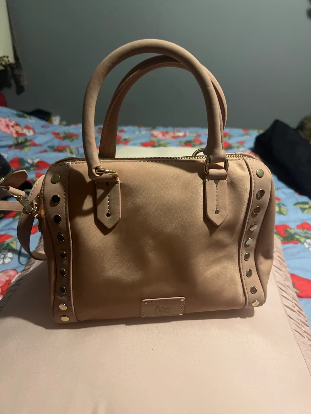 This is a cute beige satchel from RM It has gold detailing and a crossbody strap. It is in great condition!