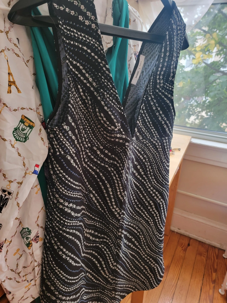 81This is a sleeveless top from marca sansoe. It features a black and white pattern and a V-neck design. It's in great condition and ready for a new home!