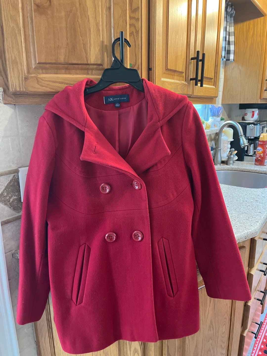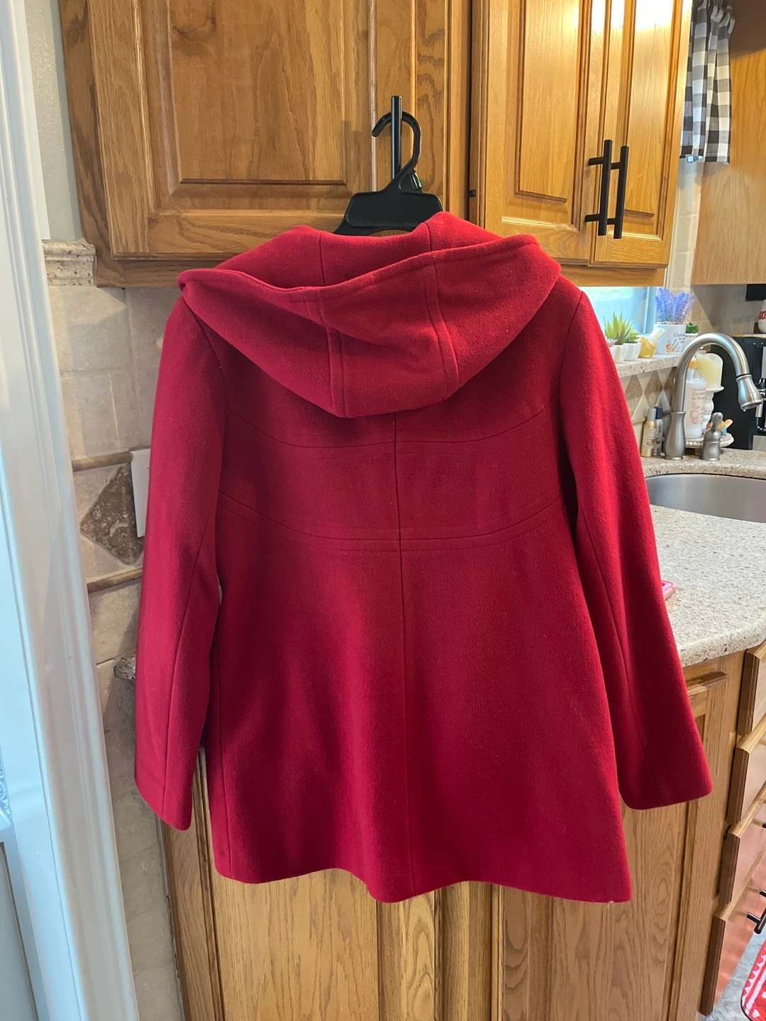 Women's red peacoat. Double breasted, hooded. Classic style. Good for fall and winter.