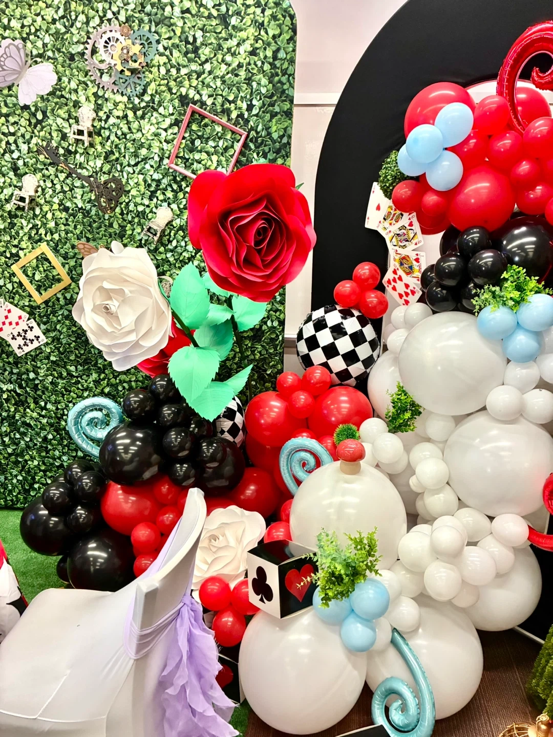 I'm selling these beautiful red and white paper flower decorations! They're perfect for adding a touch of elegance to any event or space. They are in great condition and ready to brighten up your day. 3 red and 2 white. Hand made. Used once for a Alice in wonderland set up. Set includes the steams and a nace to place 3. I will give also small paper rouses as bonus.