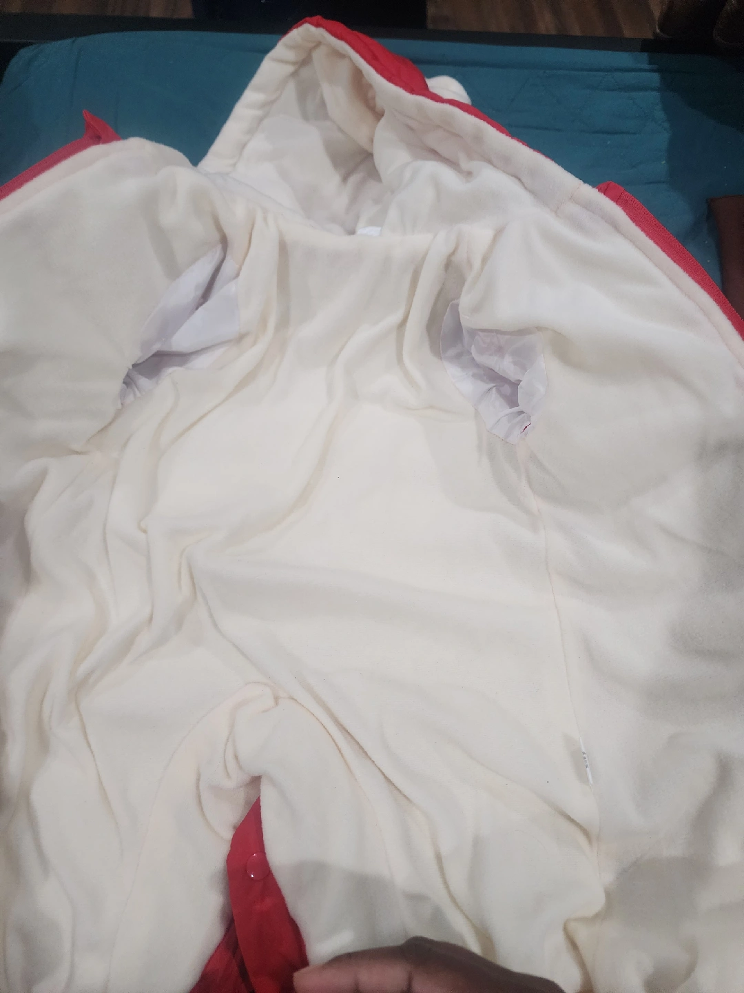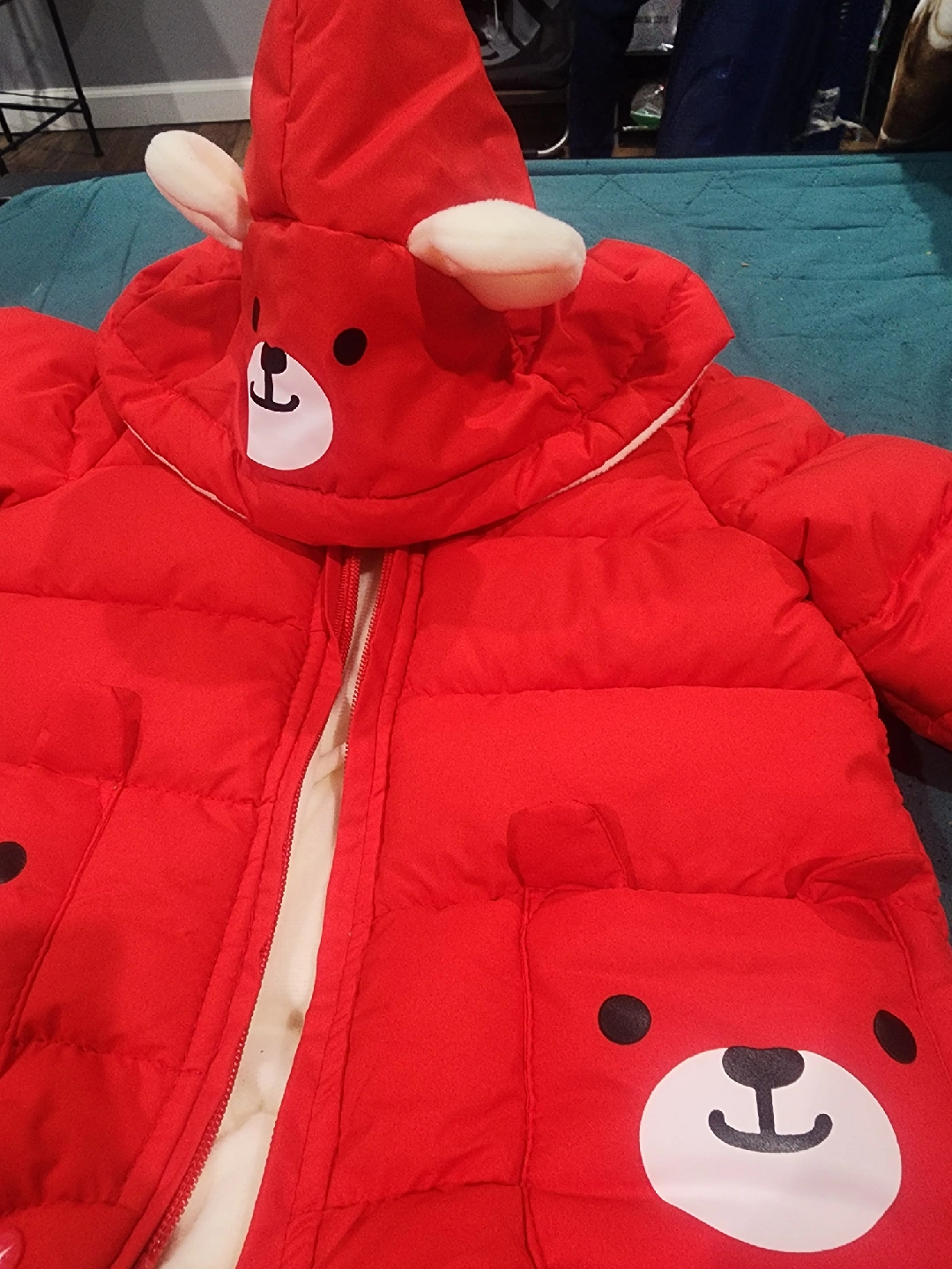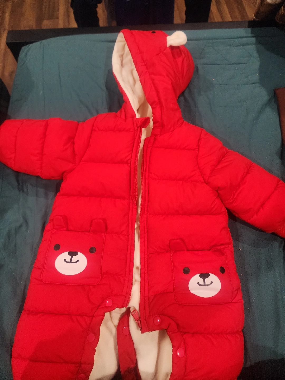 Super cute red baby snowsuit with bear details on the hood and pockets! Perfect for keeping your little one warm and cozy during the winter months. It's in great condition and ready for a new home