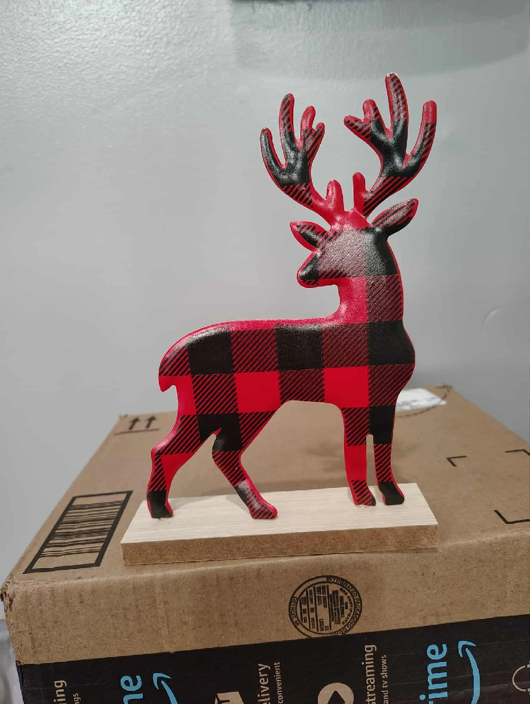 Cute red and black buffalo plaid deer decoration! It's standing on a small wooden base. Perfect for adding a touch of rustic charm to your holiday decor