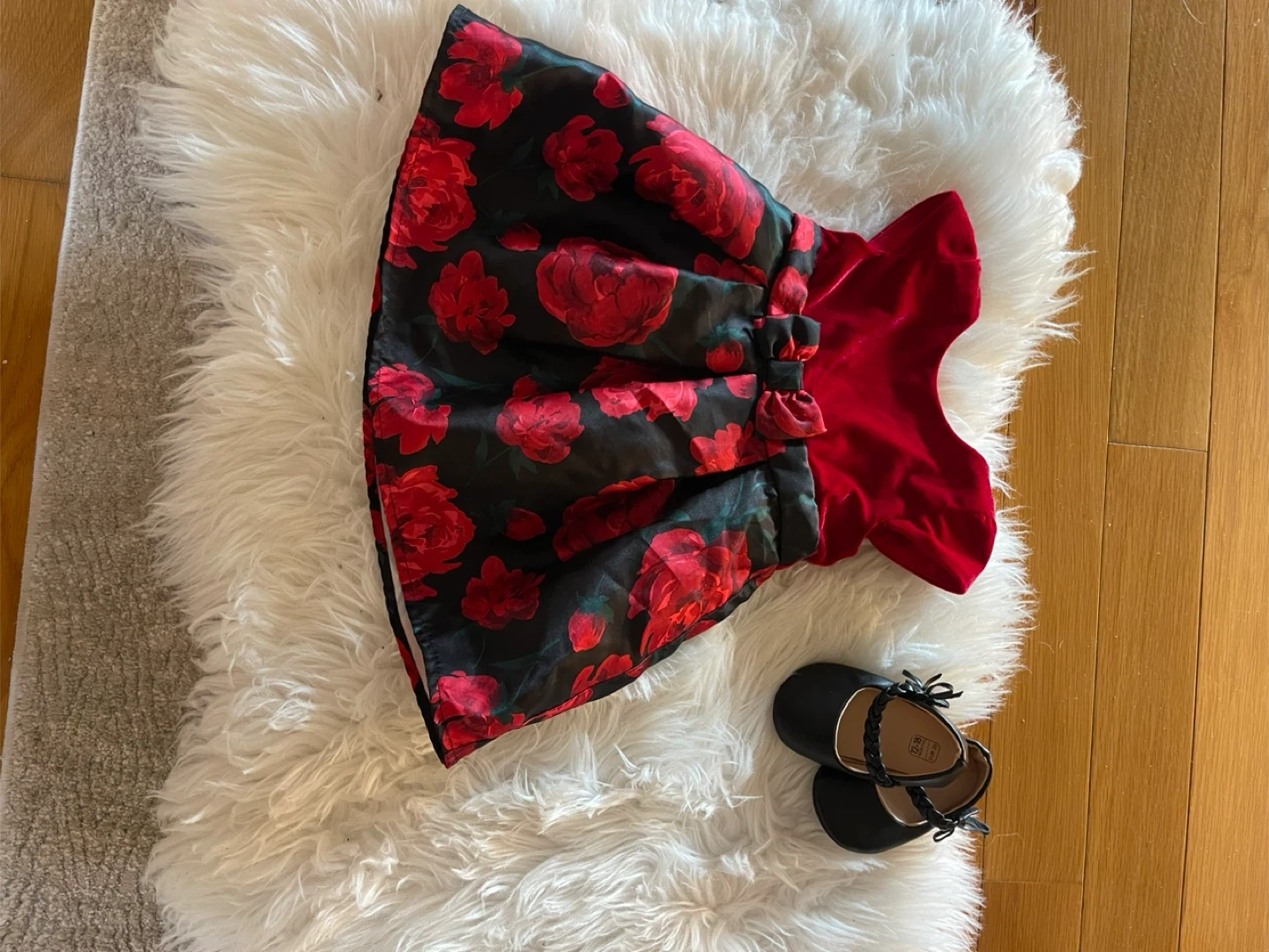 10Cute red and black floral dress, perfect for a special occasion! The dress features a velvet bodice and a full skirt with a beautiful rose print. It's in great condition and ready for a new home