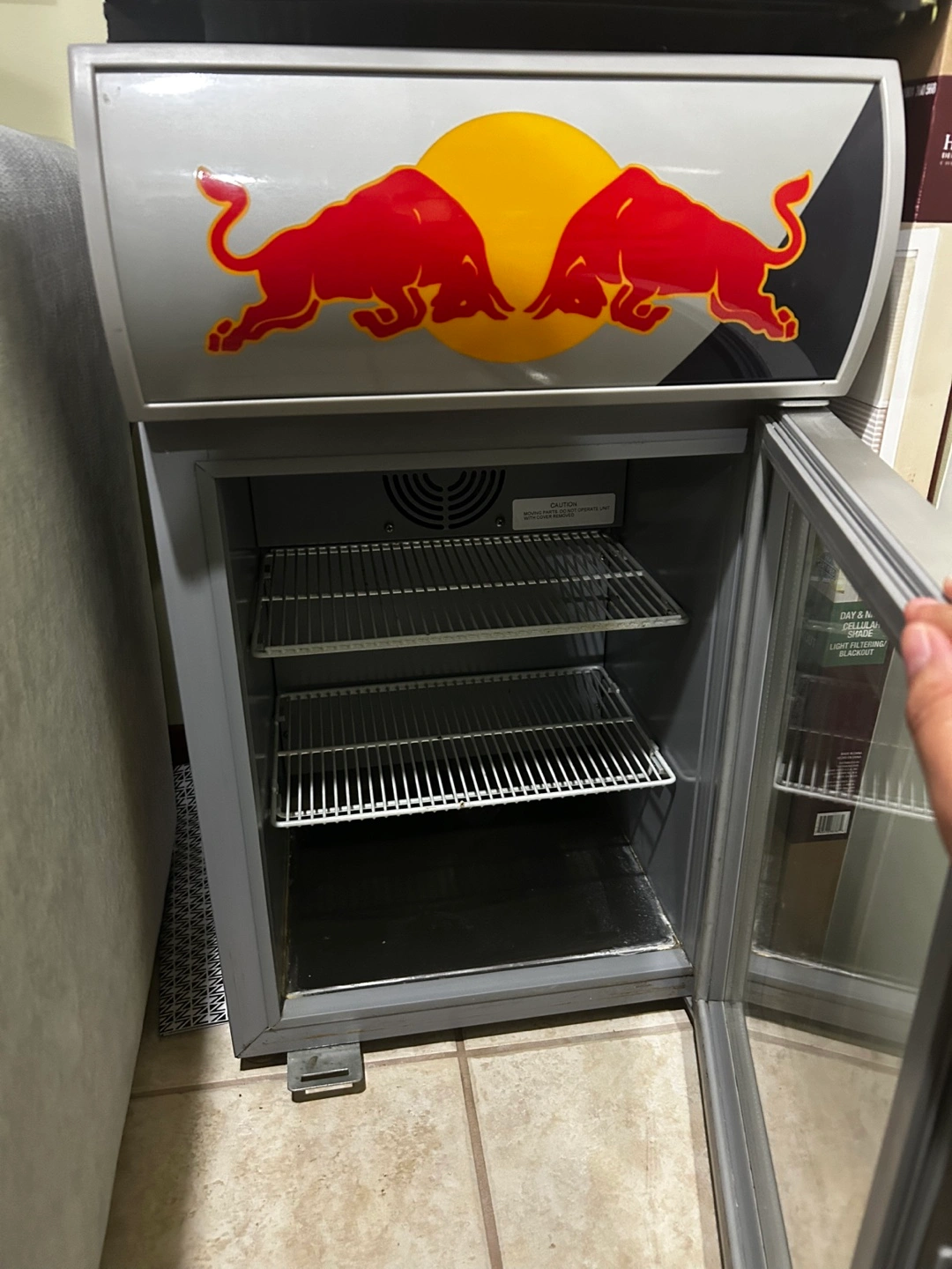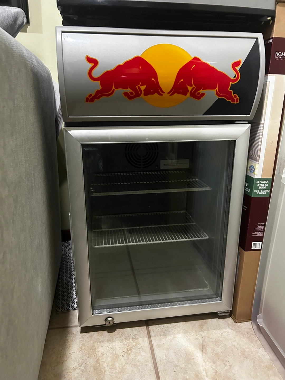 Selling a compact Red Bull miniature refrigerator. It's in good condition and perfect for a dorm room, office, or small apartment. The dimensions are approximately H 28" x W 17" x D 17" It features adjustable shelves to accommodate different items. Great for keeping your drinks and snacks cold!