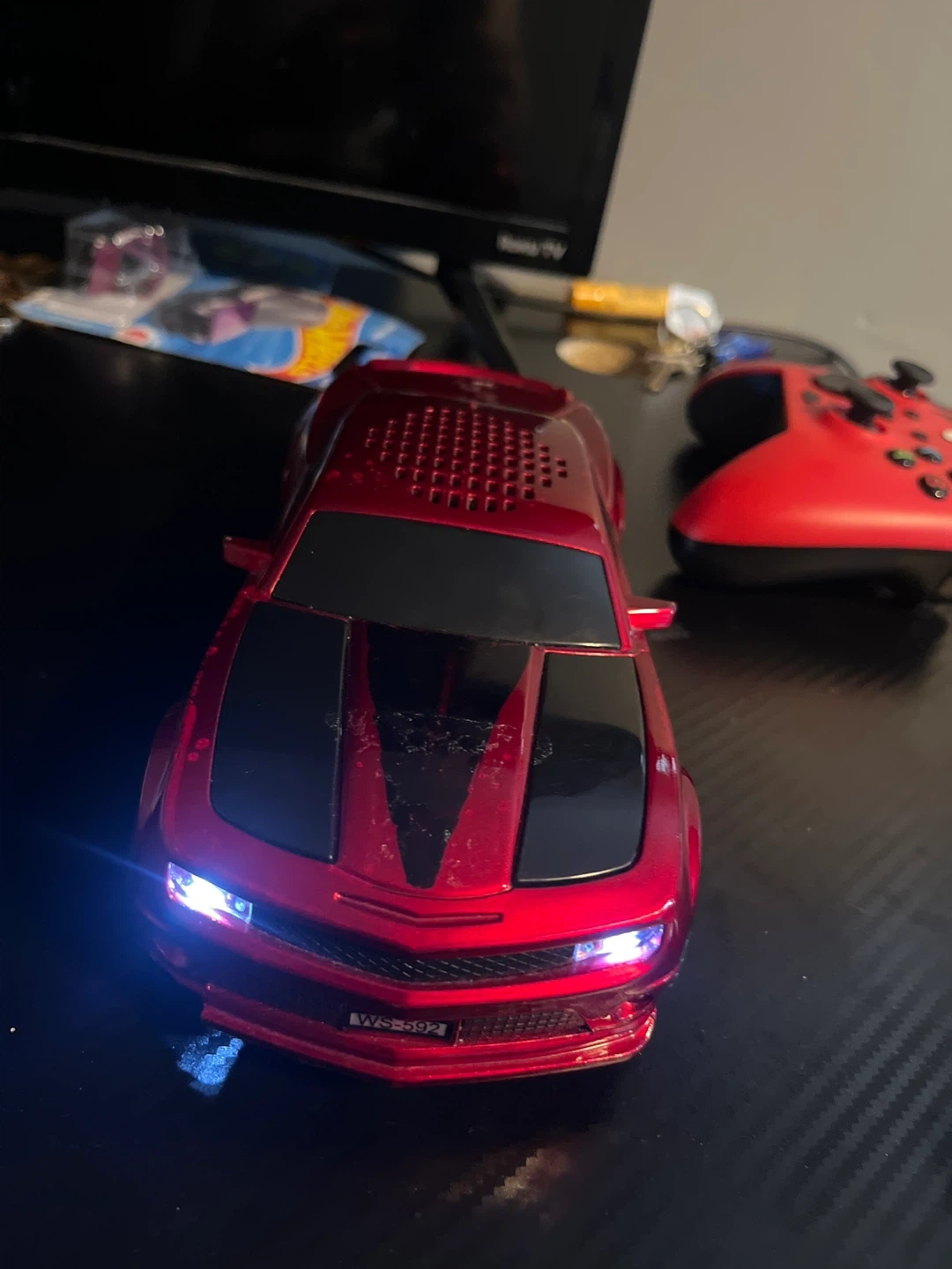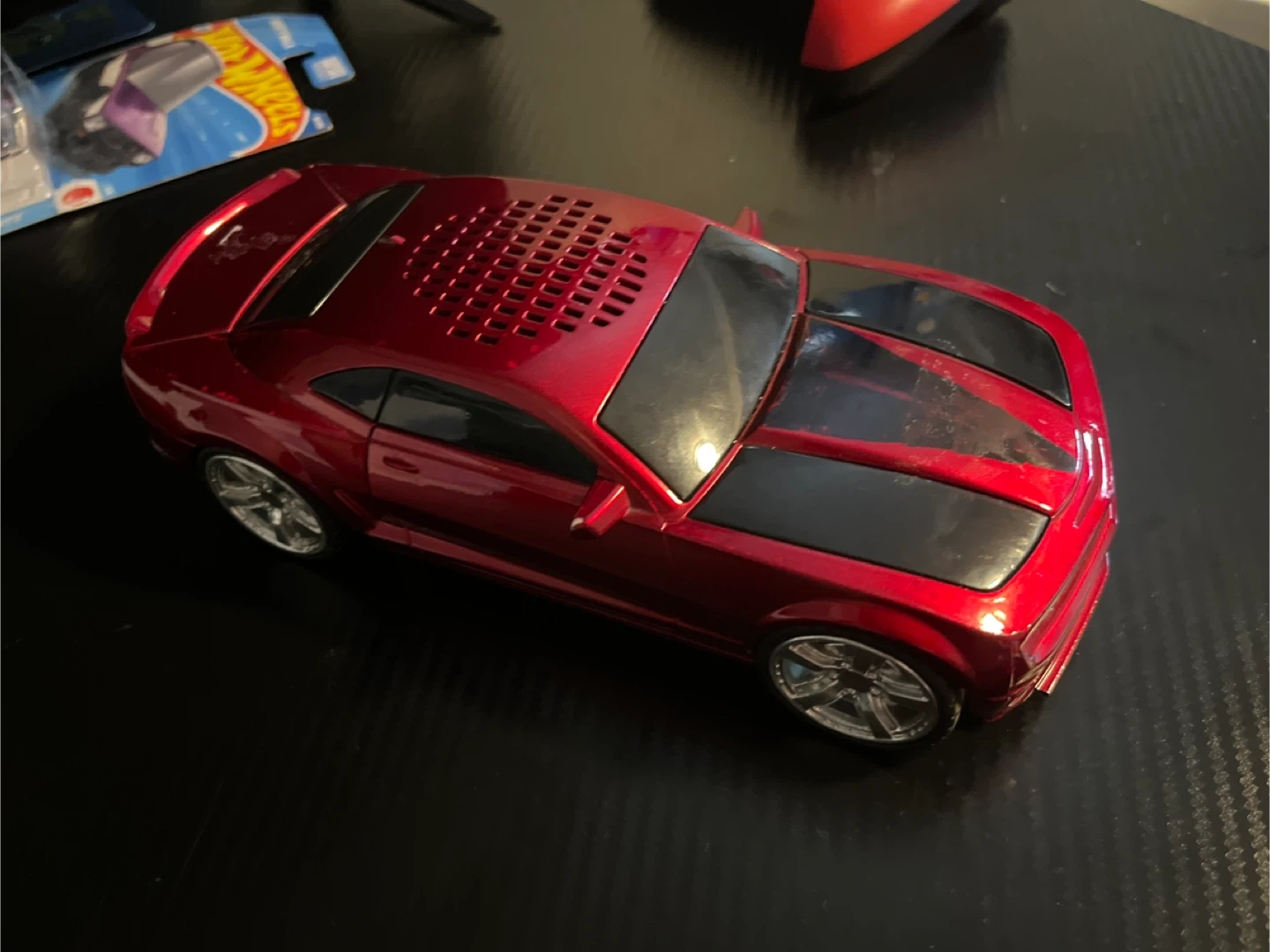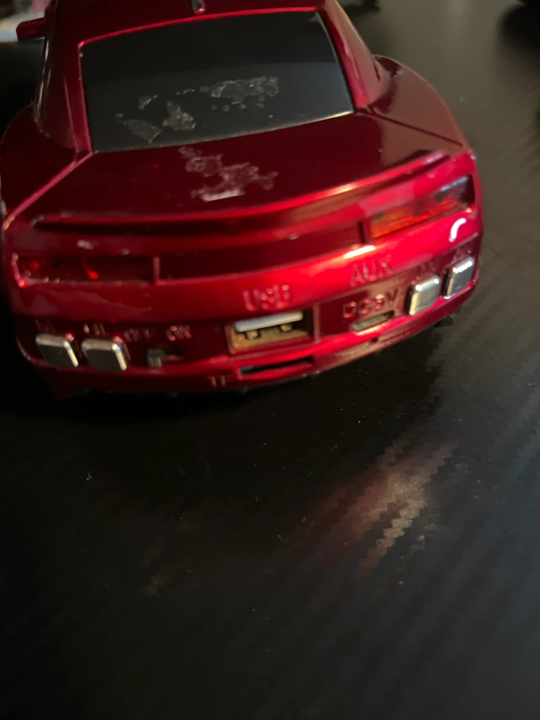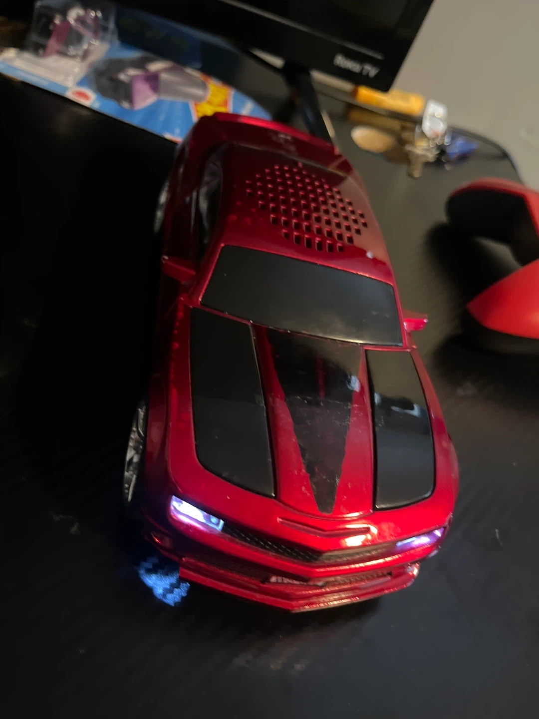 Selling a red Camaro WS-502 car speaker. It has a USB and AUX input. It has some wear and tear.