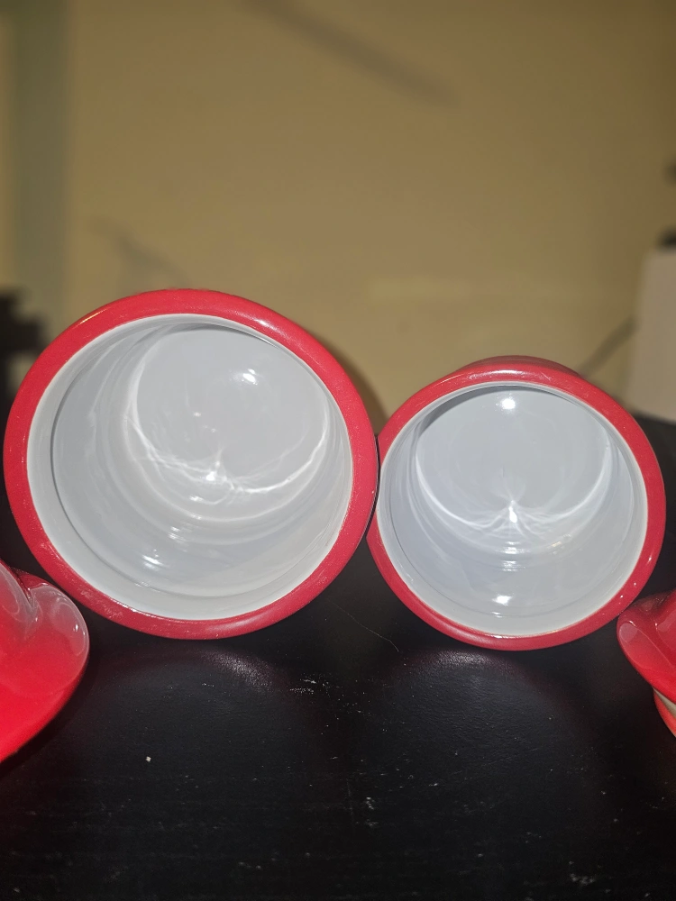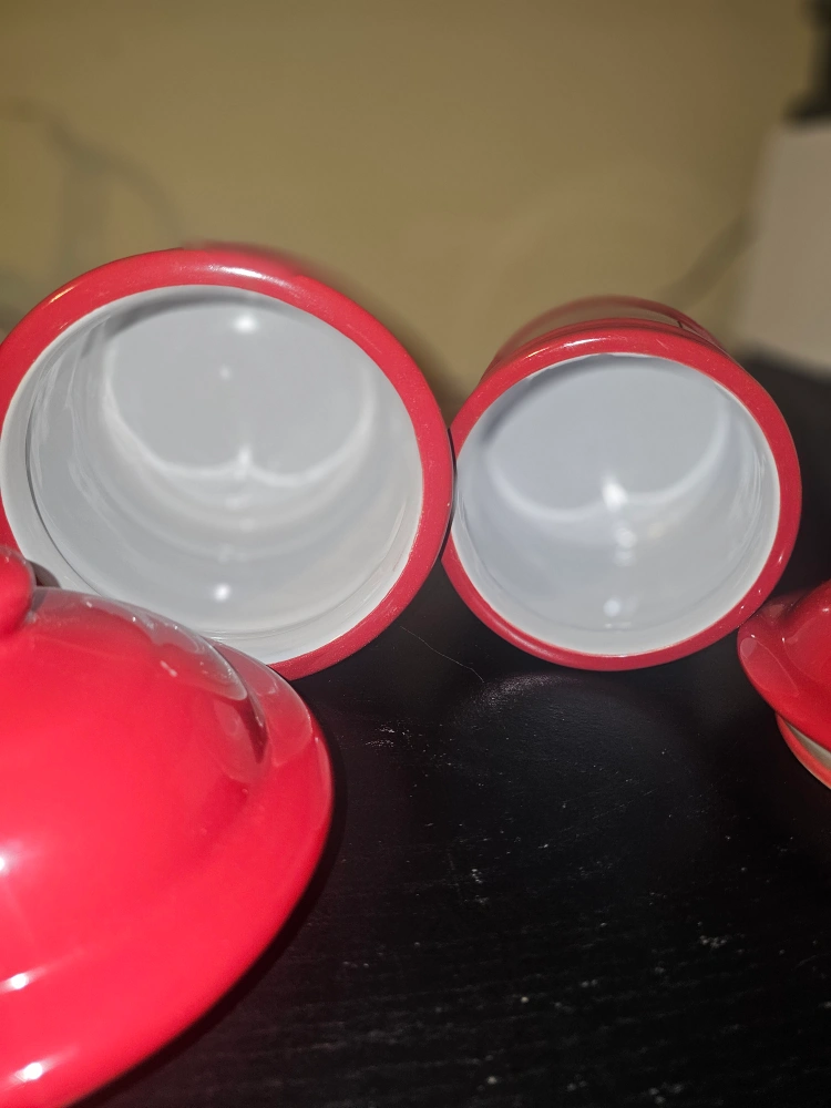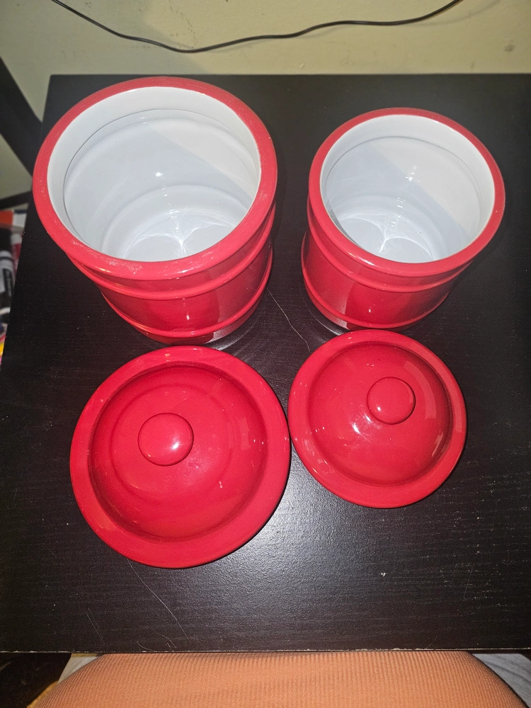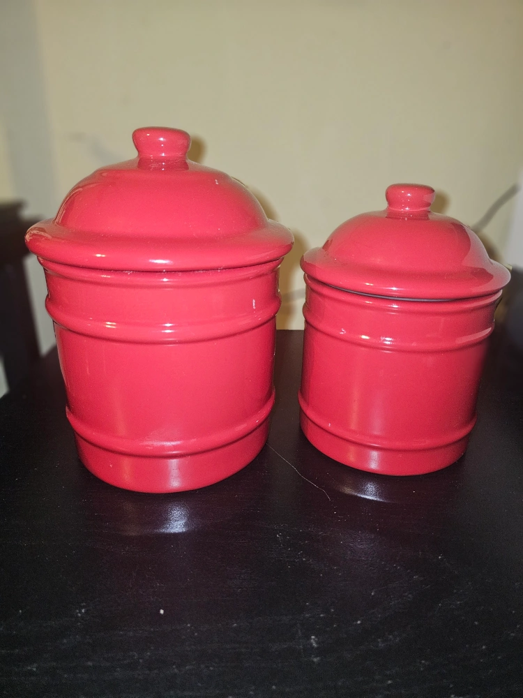 Selling a set of two red ceramic kitchen canisters. They're perfect for storing sugar, flour, or coffee. The bright red color will add a pop to your kitchen decor
