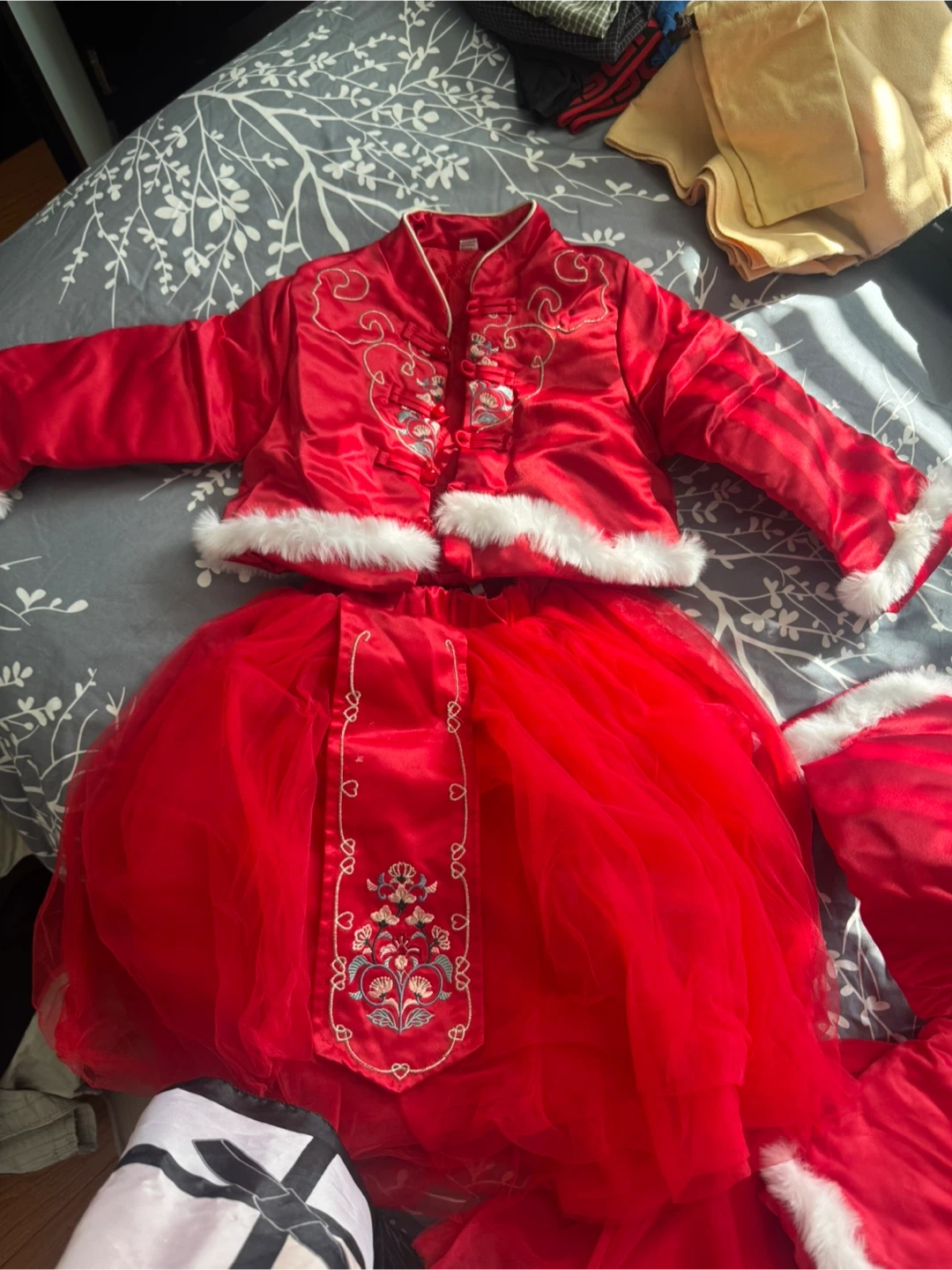 Selling a beautiful red dress with a Chinese-inspired design! This dress features intricate embroidery and a festive color, perfect for special occasions or cultural celebrations. It includes a matching jacket with fur trim. The dress is in great condition and ready for a new home🥕
