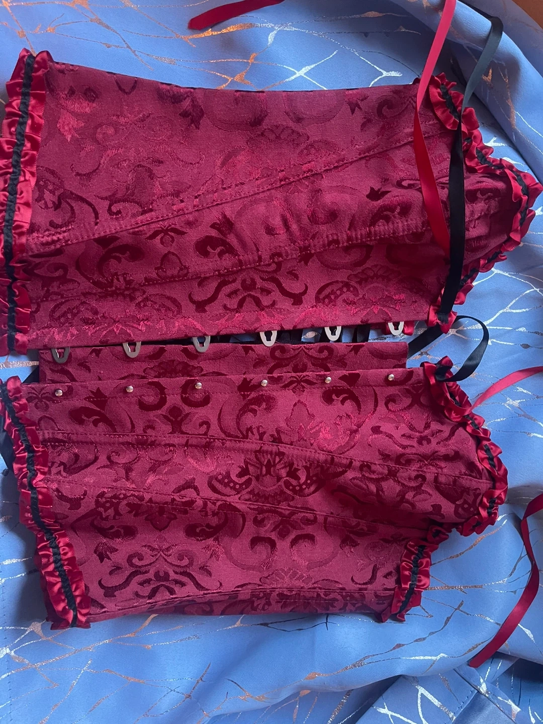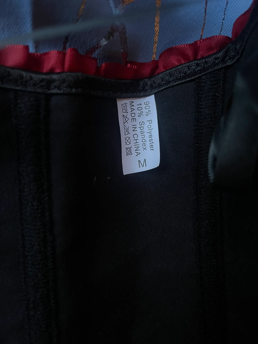 Selling a beautiful red corset in size M but runs small. That’s why was never used. It's made of 90% polyester and 10% spandex. The corset has a lovely damask pattern and is in great condition