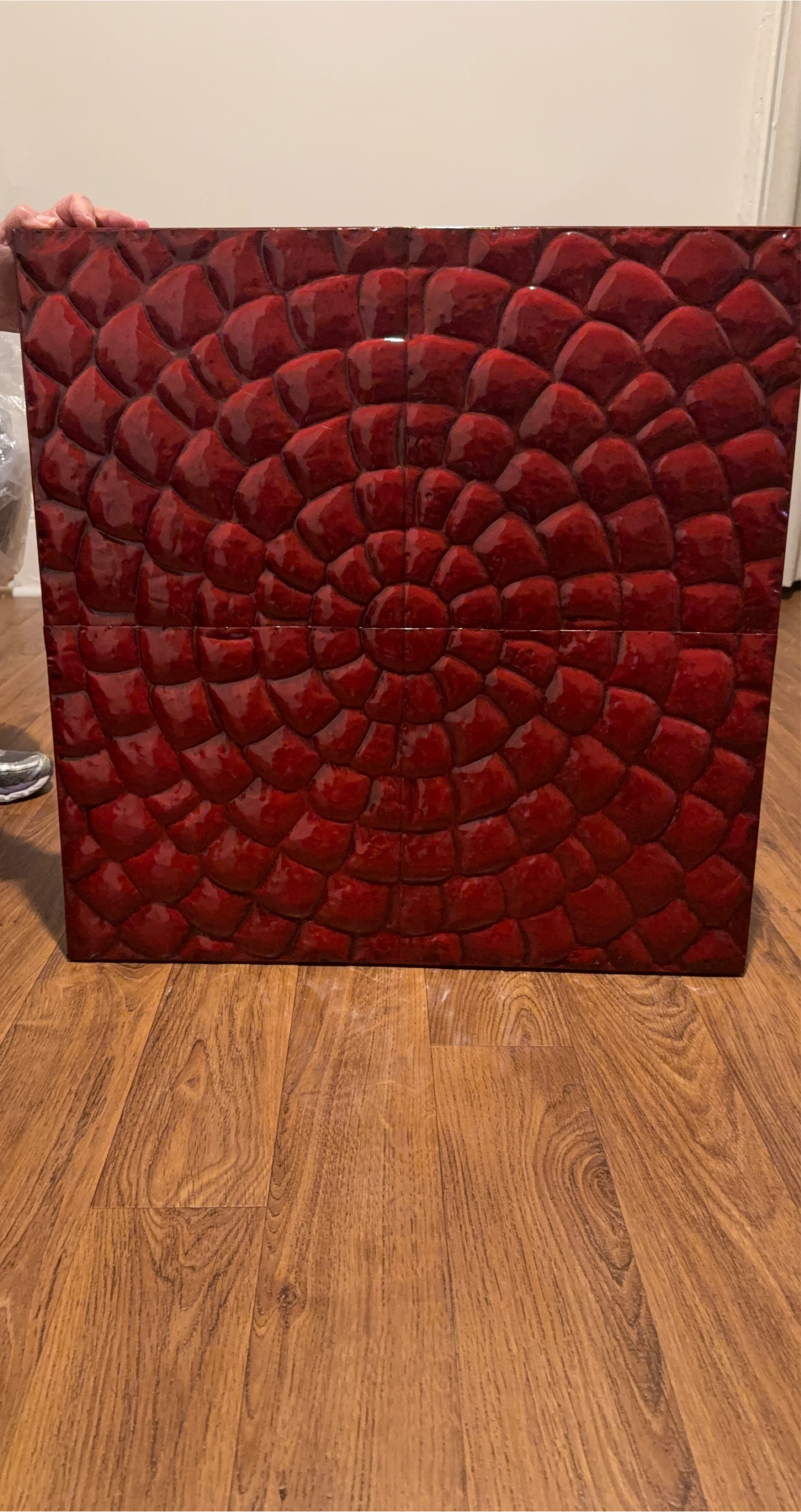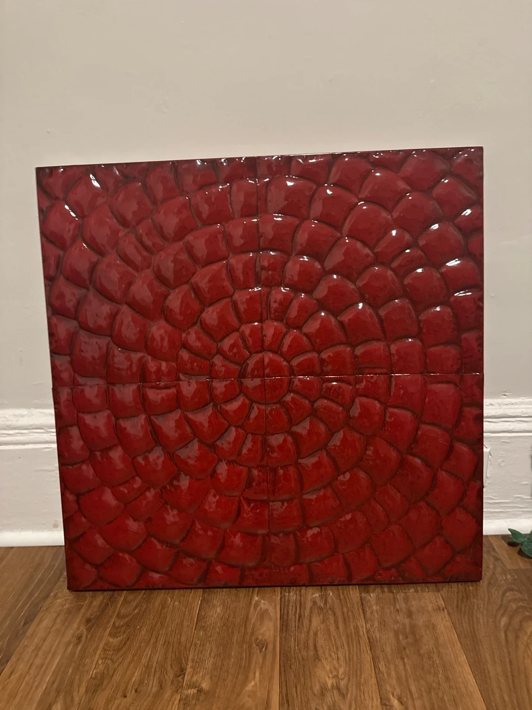 This is a decorative piece of wall art with a unique, textured design. It has a square shape and a vibrant red color that adds a pop to any room. It's in good condition and ready to hang!