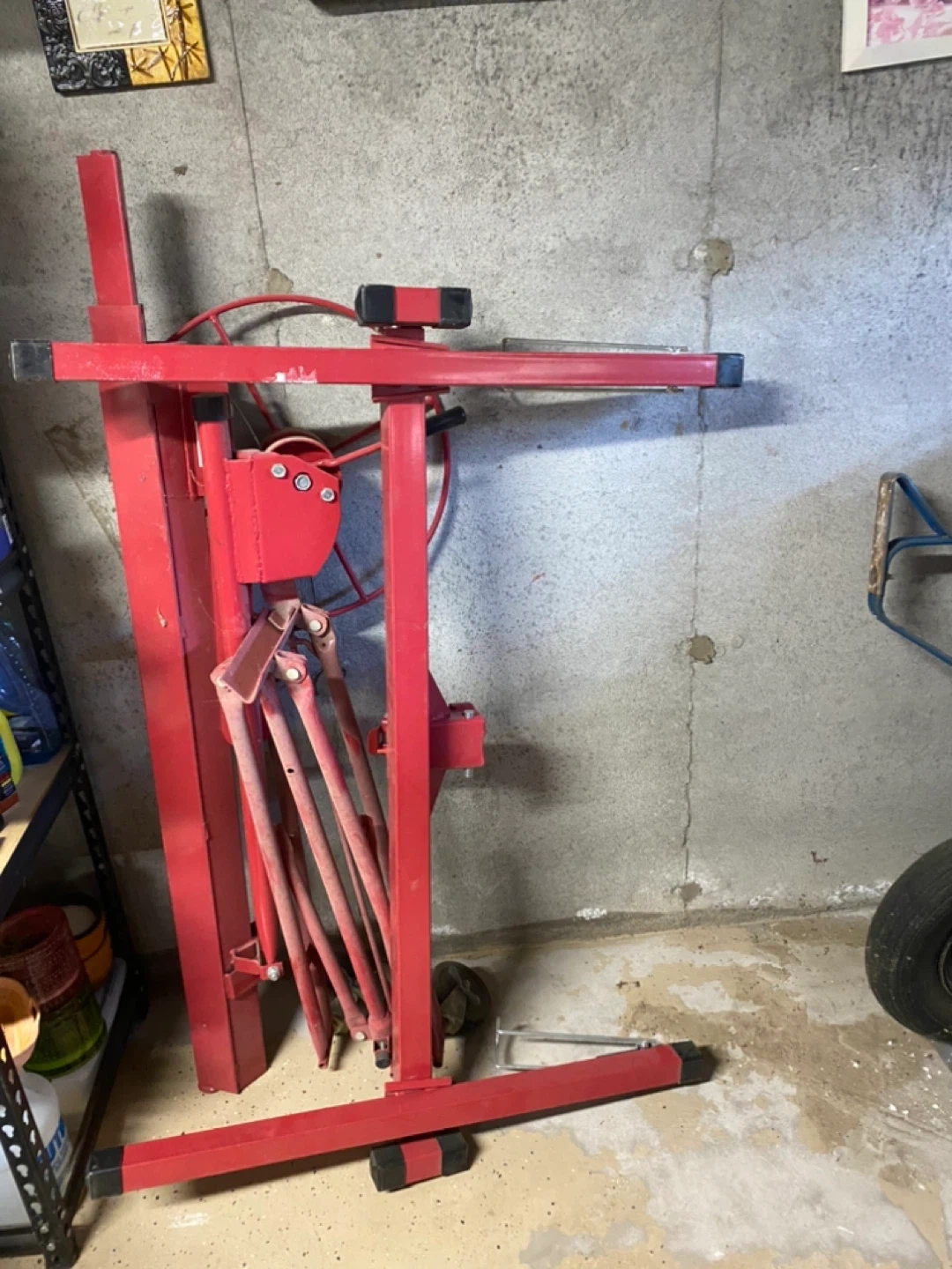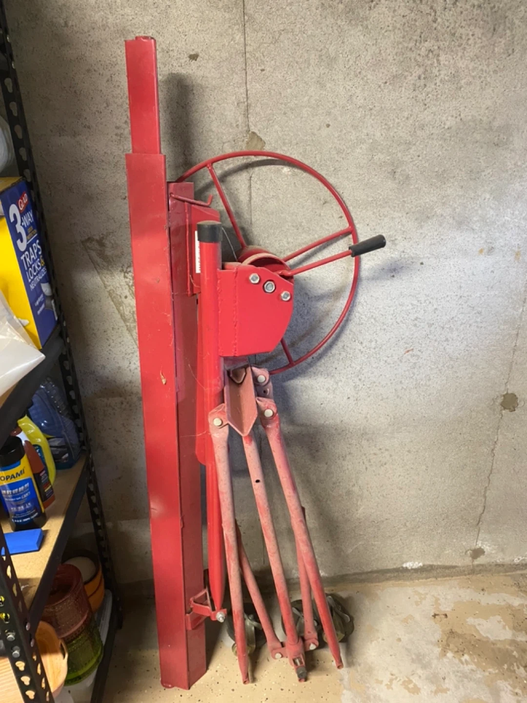 Selling a red Drywall lift engine support bar. It looks to be in good condition and ready for use, for Sheet-rock construction work