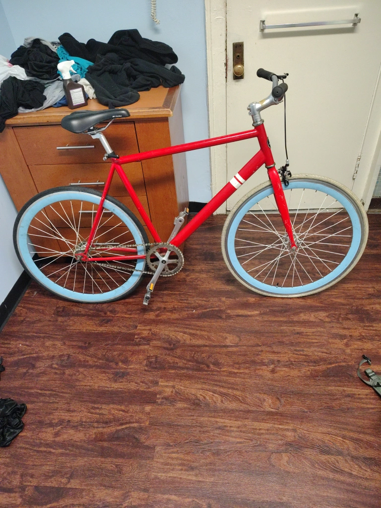 Selling a red fixed gear bike with light blue tires! It's in good condition and ready to ride. Perfect for getting around town or just enjoying a leisurely ride