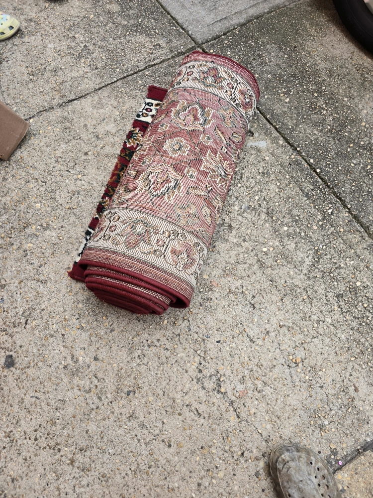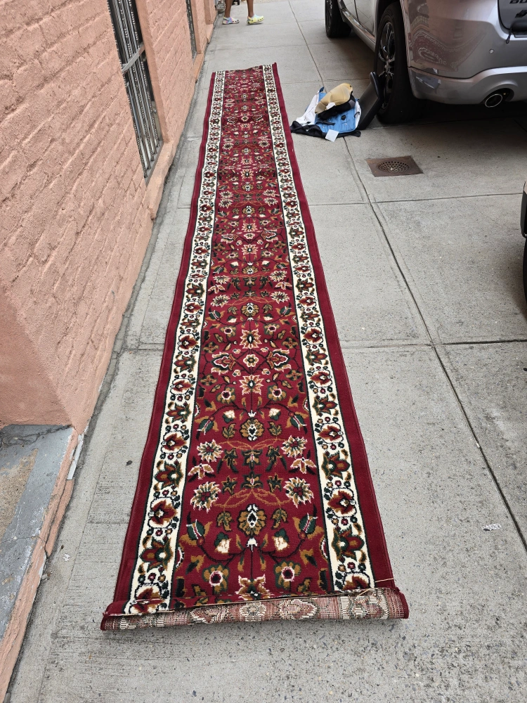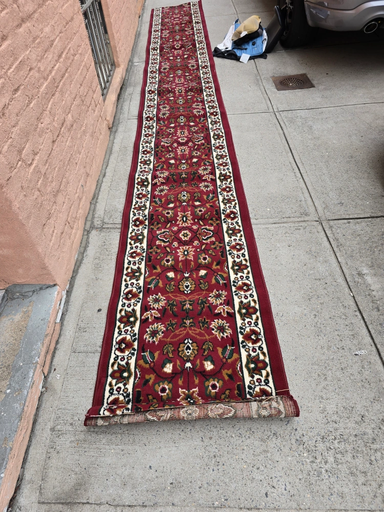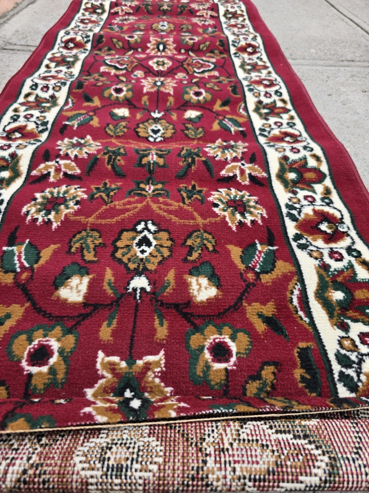 Here's a long runner rug with a red floral pattern! It would be great for a hallway or any narrow space in your home. It's in good condition and ready to add some warmth and style to your place