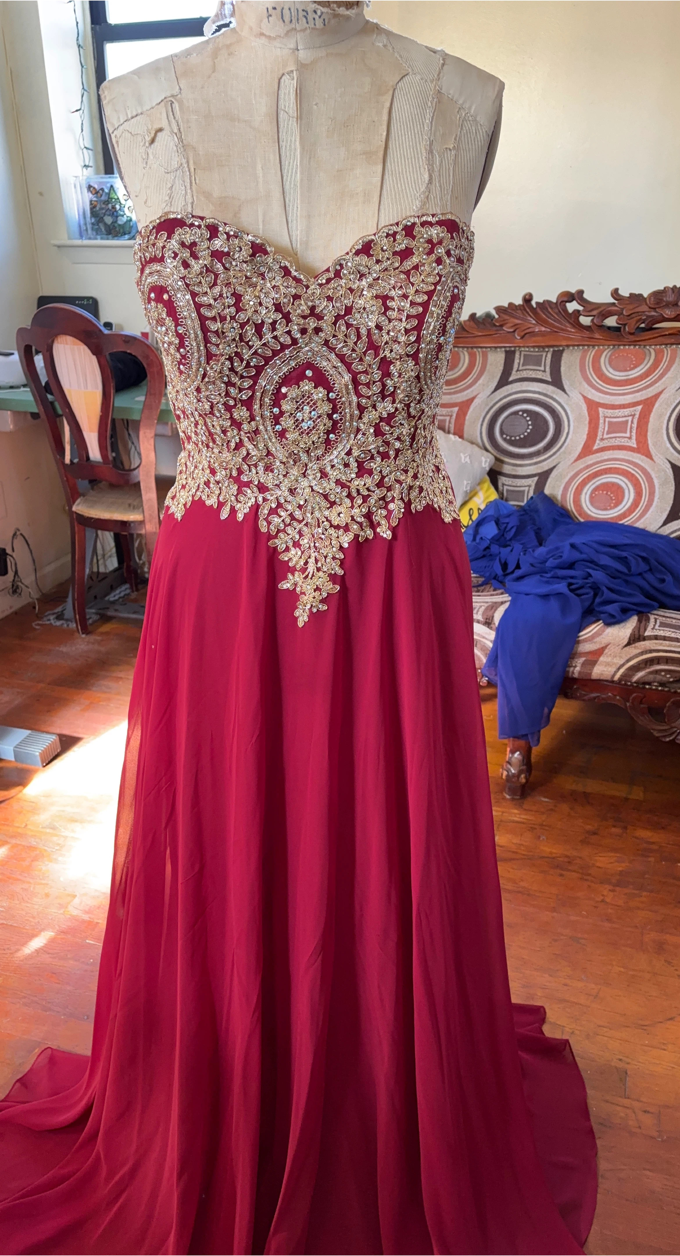 10Beautiful red formal dress with intricate gold embroidery on the bodice. Perfect for a special occasion!