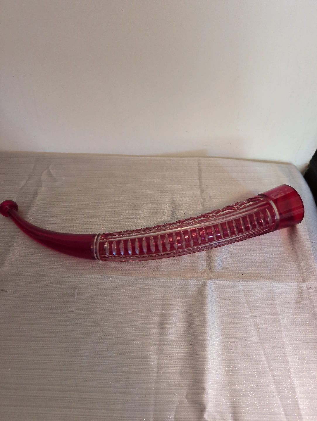 Selling a beautiful red glass cornucopia vase. It features a unique shape and intricate detailing. Perfect for adding a touch of elegance to any room!