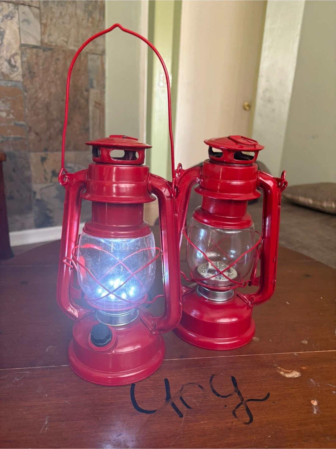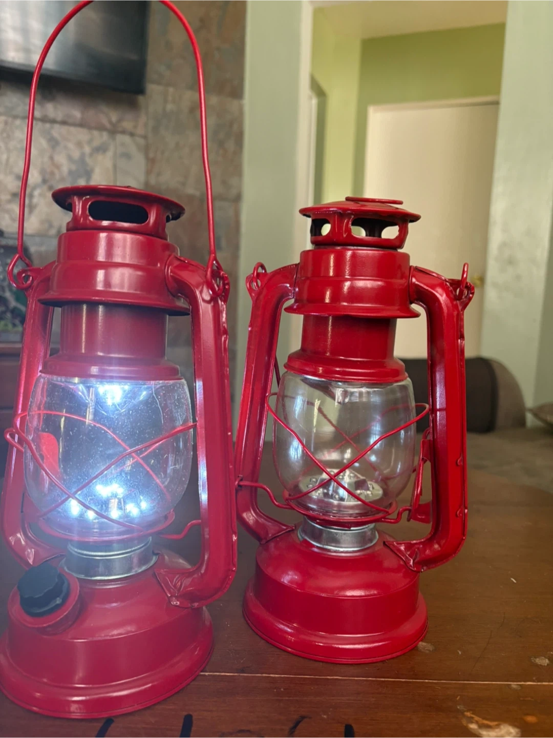 Selling a set of two red kerosene lanterns. They are in great condition and ready to use. Perfect for camping, emergencies, or adding a rustic touch to your home decor