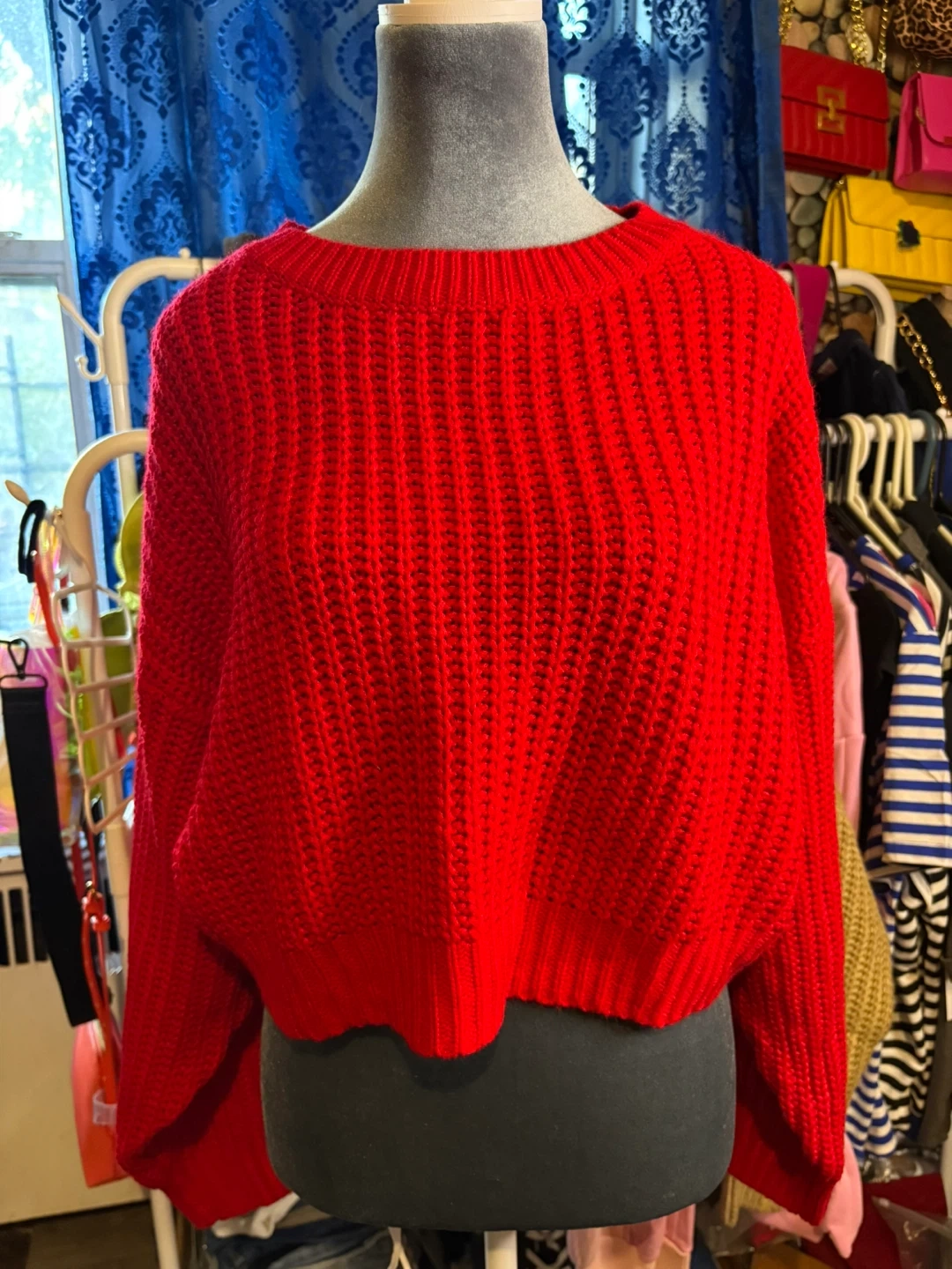 Here's a cozy red knit sweater! It's in great condition and ready for a new home