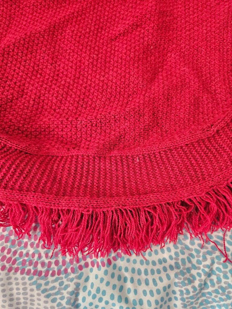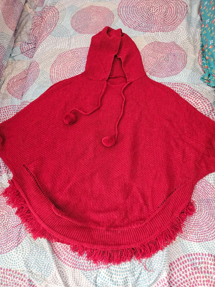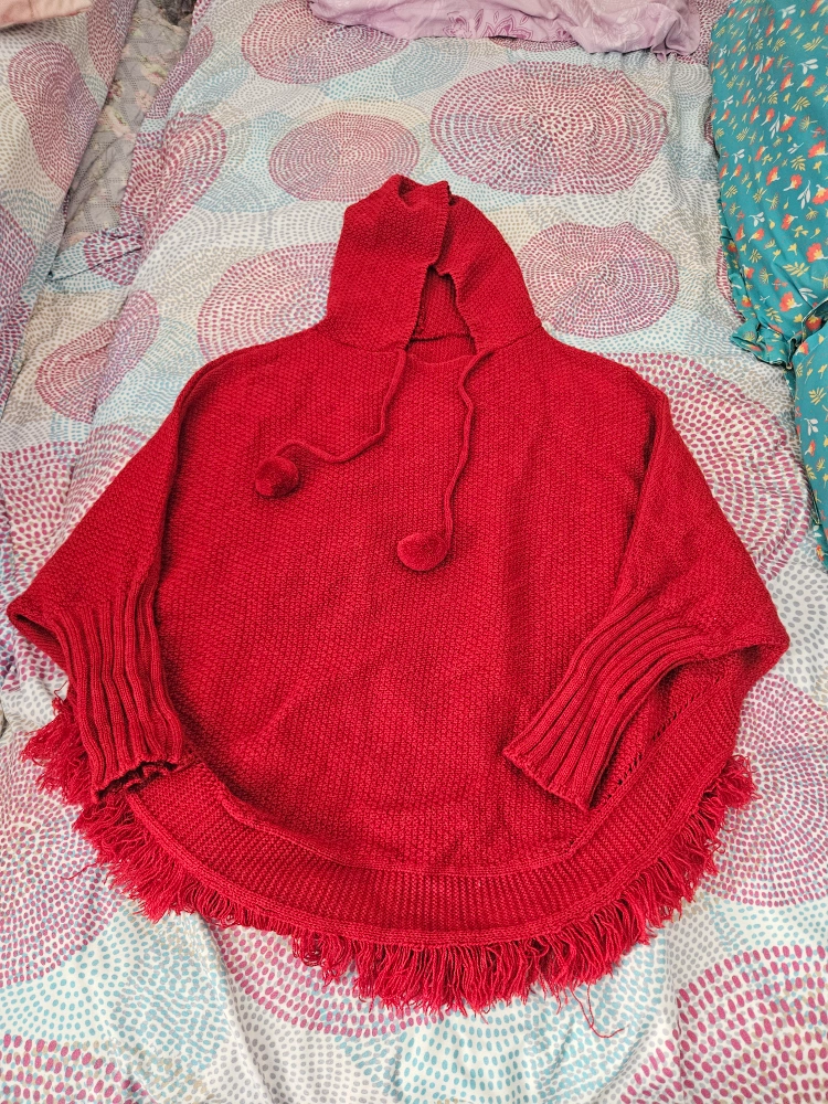 Selling a cozy red knitted poncho with a hood! It features cute pom-pom details on the hood's drawstrings and a stylish fringe trim. Perfect for adding a pop of color and warmth to your outfit!