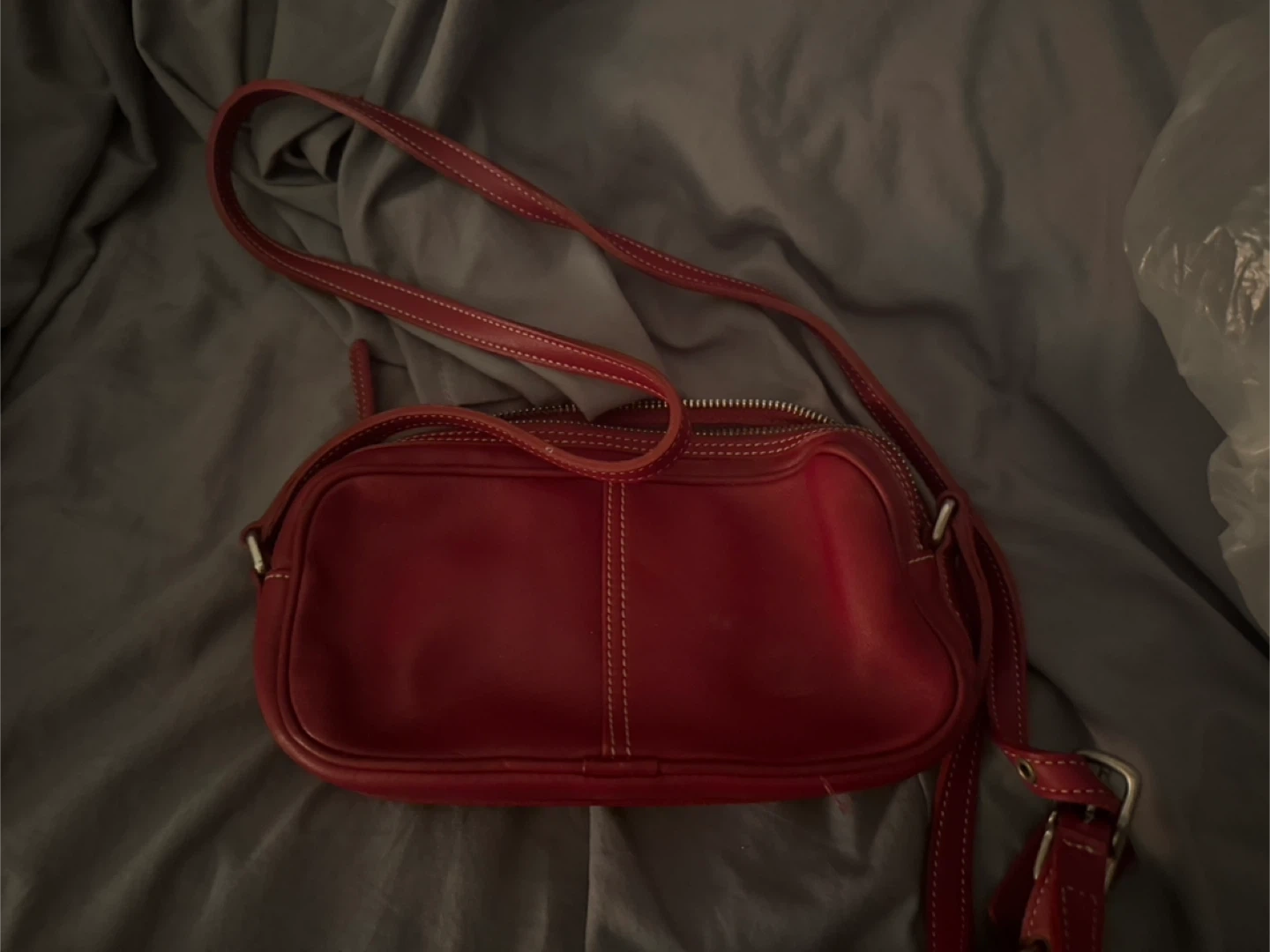 Selling a cute red leather crossbody bag! It's in good condition and has a zipper closure. Perfect for everyday use