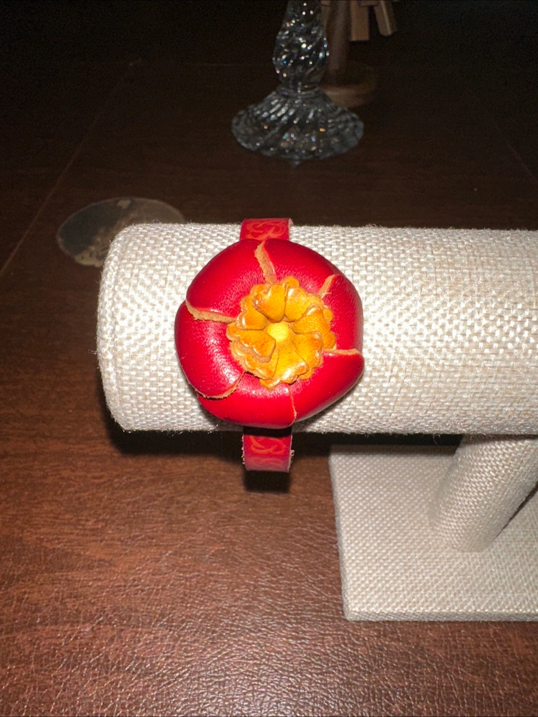 This is a unique red leather bracelet with a flower accent. It has a snap closure for easy wear. The flower is a bright yellow color.